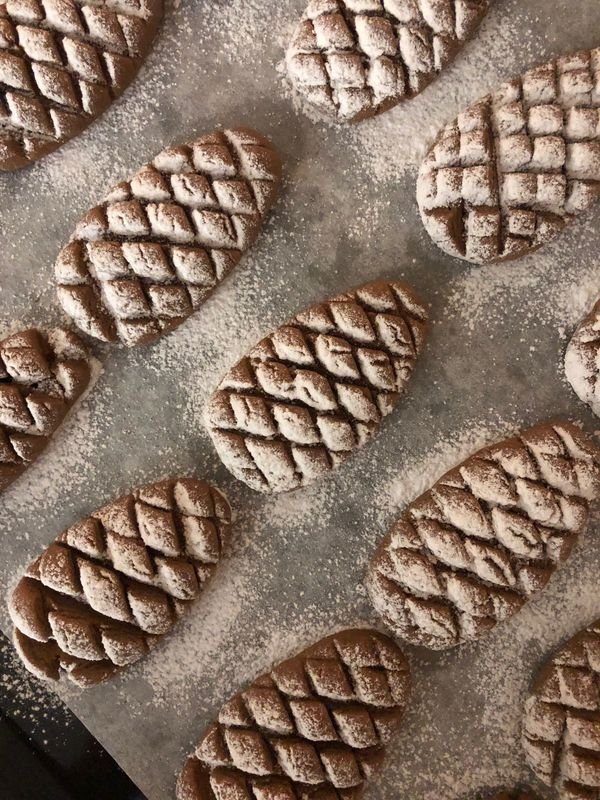 Спустя 2 часа тесто смазываю белком и присыпаю сахаром (коричневым или белым - это по желанию). Разрезаю на порционные кусочки толщиной 7-8 мм и выкладываю на противень, застеленный пергаментной бумагой.