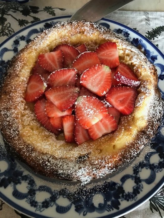 Это блины, которые выпекаются (быстро) в духовке. Можно украшать по своему вкусу. Получается довольно сытный завтрак выходного дня--"блин-омлет-запеканка".