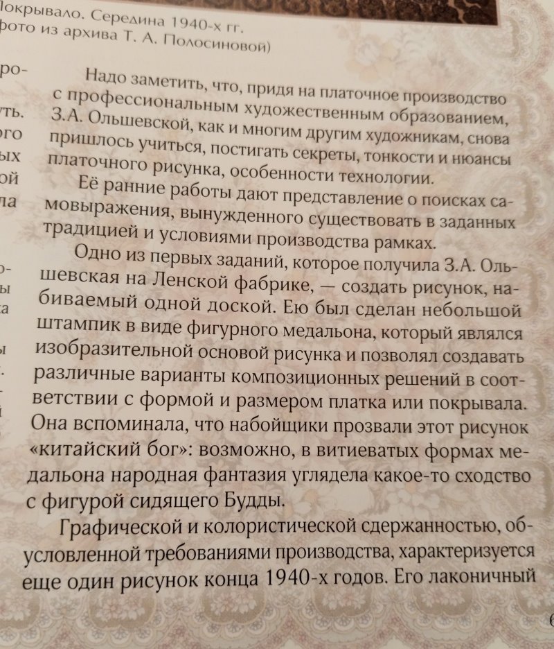 Из книги И.К.Ушаковой, Г.И. Журавлевой "Неповторимые узоры судьбы, к 100-летию народного художника России Златы Ольшевской" Павловский Посад, 2020.