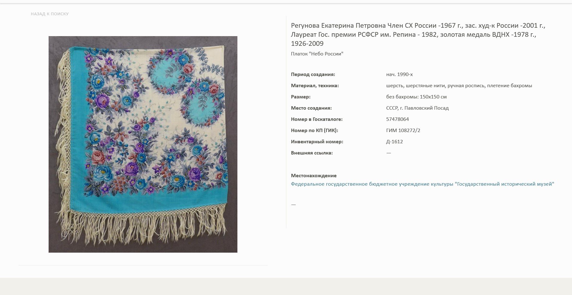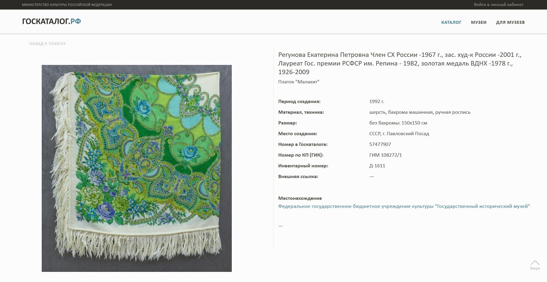 В коллекции Государственного исторического музея обнаружились еще две рукописные шали Екатерины Петровны Регуновой - "Малахит" и "Небо России". Сведения из Госкаталога.