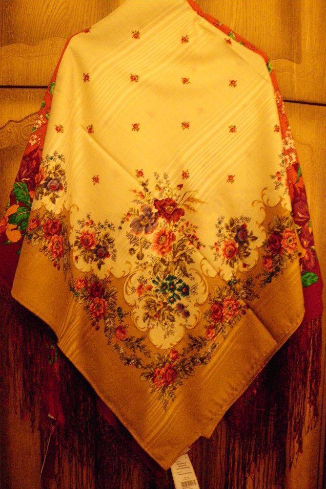 Фон платка - кремовый, кайма - светло-коричневая. На фото платок получился более золотистым, чем он есть на самом деле. Кайма темнее и цвет ее немного уходит в рыжевато-кирпичный. Наверное, самое подходящее определение для него - корица.