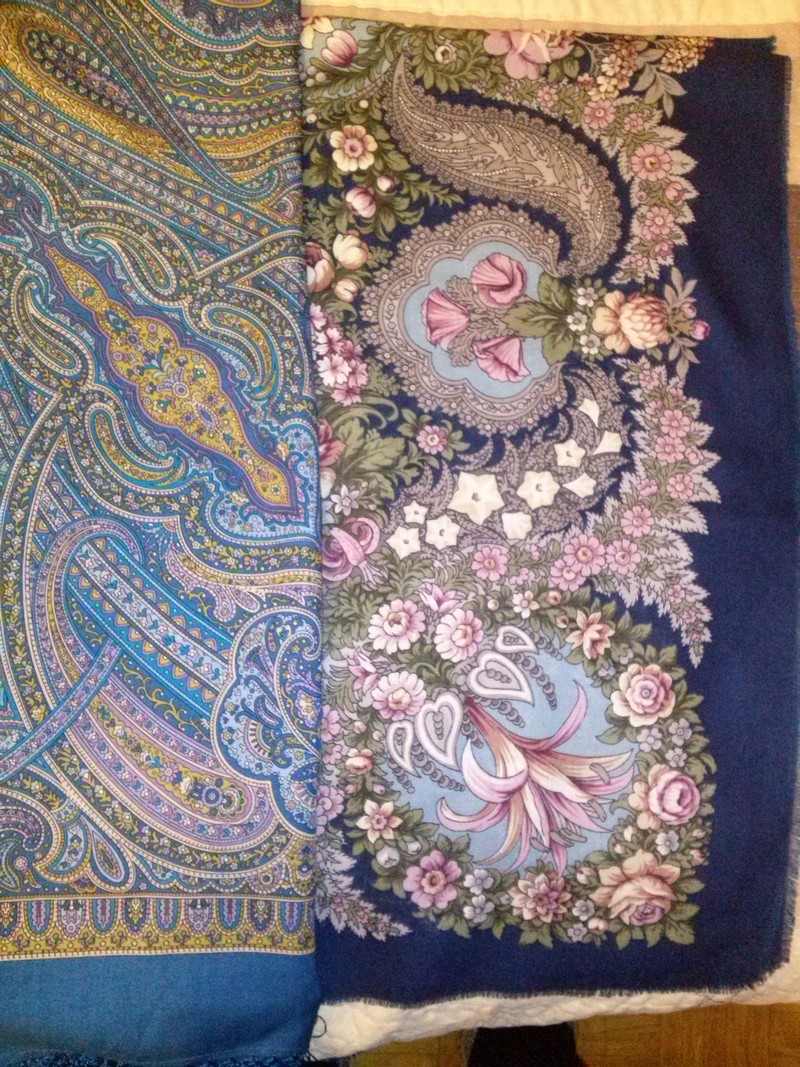 НСВ-15 и ТВ-12. Снимала со вспышкой, цвета почти как в реальности (на моем экране); у НСВ кайма не чисто синяя, а уходит в темную бирюзу. Напишите, что именно вас интересует, завтра могу поснимать при дневном свете.Regata писал(а): Может ли кто-нибудь сравнить Над серебряной водой-15, Русские сезоны-14 и Таинственный вечер-12 или какие-нибудь два из этих платков?