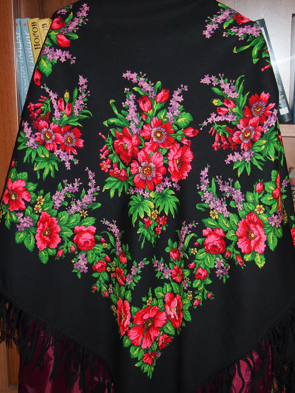 Ткань на платках тогда была очень плотной, почти как на уплотненке сейчас. Но после многолетней носки и стирки ткань стала немного тоньше, рисунок чуть-чуть побледнел, но все равно плат очень-очень красный и красивый.
