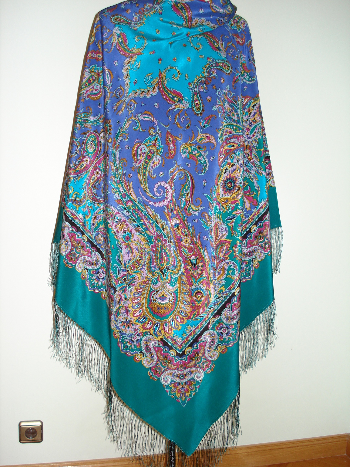 На этикетке платка стоит 9 колорит, он совершенно отличается от показанного в Утечке информации... Там низки бирюзовые - здесь синевато-сиреневато-фиолетовые, там кайма и средник именно густо-бирюзовые, как на туркменских заказных, а здесь кайма в зелень, этакая смесь малахита и морской воды, средник же чисто бирюзовый, много светло-бирюзового и в орнаменте. Явно два разных колорита. Наверное, будет и показанный в Утечке... Подождем - сравним, полюбуемся.