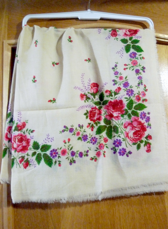 Вот еще одна большущая шаль 1982 года издания. Сохранилась даже этикетка и бумажная обертка из московской "Березки". Не смогла толком разобрать артикул, однако.
