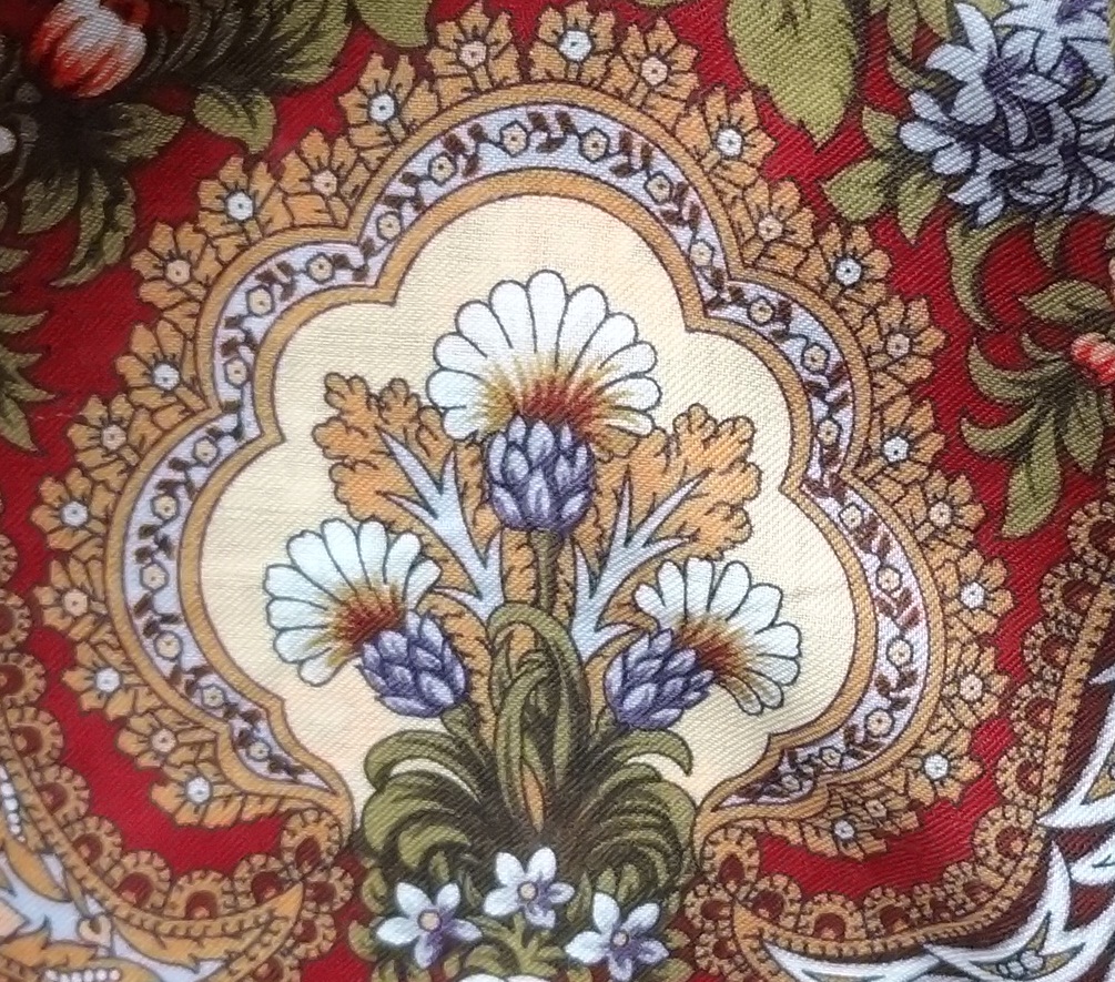 Хороший, спокойный темно-красный цвет, одинаковый на кайме, середине и в центре платка. Общее ощущение от платка-теплое. "Освежают" серебристо-серые орнаментальные узоры и синие цветочки. Листики оливковые, в медальонах-персиковый, цветы коралловые и коричневатые. Снимала без вспышки, на балконе, но красный кажется ярче, чем есть на самом деле.
