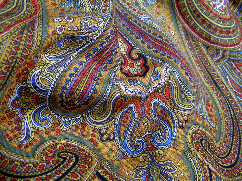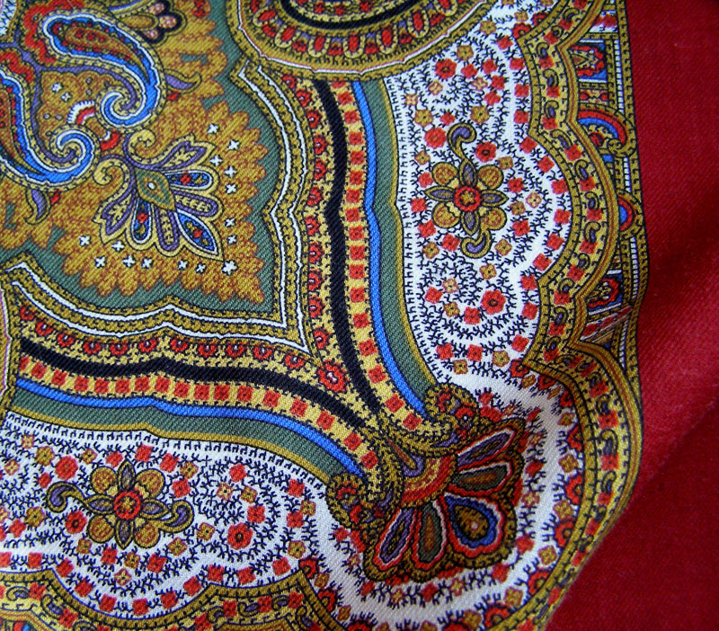 На самом деле это шаль (в данном случае 149х149см). Ткань тонкая. Шерстяная клетка. На изнанке вшита белая х\б этикетка (маленький кусочек ткани) с №4 (может это артикул и можно по нему опознать шаль или автора - спрошу у platki). Кстати на Рапсодии Клары Зиновьевой такая же этикетка с номером 83 (или 89-немного выцвело). Шаль в некоторой степени монохромная - оттенки оранжевого от огненно-морковного до апельсиново-рыжего и рыжевато-коричневого, болотного. Трудно передать цвета. Шаль очень яркая, огненная. Изощрялась и со вспышкой и без вспышки.