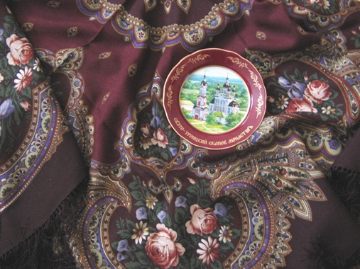 На праздник получила в подарок два платочка.Один из них,мне кажется,принадлежит кисти В.Фадеевой.Платок старый,еще с люрексом ,год выпуска 1990,размер 90х90,арт.77р,с осыпкой