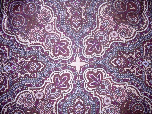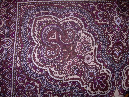прдавался яркий платочек, который меня заинтересовал. Я его купила (200 р.), принесла домой, немедленно залезла в форум. Короче, через част усиленных поисков я узнала как его зовут: Майские сумкрки, г. Сотскова, 1982 г. (Спасибо инфо Mlava). В базе у нас он проходит в синем колорите с размером 72 х 72 см. У меня же платочек оказался следующего размера: 91х92 см. (возможно, несколько сел, если его стирали, но платочек НЕ линялый, цвет с лица насыщенный, а изнанка более блеклая). Кайма ровная, ассиметрии нет. Подрублен, обвязан шерстяной бахромой без клеток. Бахрома родная))). Платочек очень мне понравился. Веточки в рисунке чем-то напомнили мотив средника "Цветущего сада". Милый небольшой платочек. Попытаюсь приложить фото. Съемка в комнатных условиях при естественном освещении, без фотовспышки.