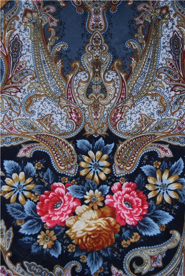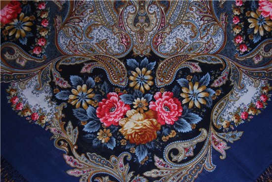 Снято без вспышки на балконе. Вечером, думаю, результат будет иным, цвета поменяются. Шаль яркая, но даже не за счет такого фона, а из-за ярких больших розово-красных цветов (розы? или георгины?), контрастной зелени и яркого голубого. Почему-то мне она кажется в стиле модерн, наверное это не правильно, но есть в ней и что-то общее с Белыми розами, такая беспокойность и что-то еще неуловимое.