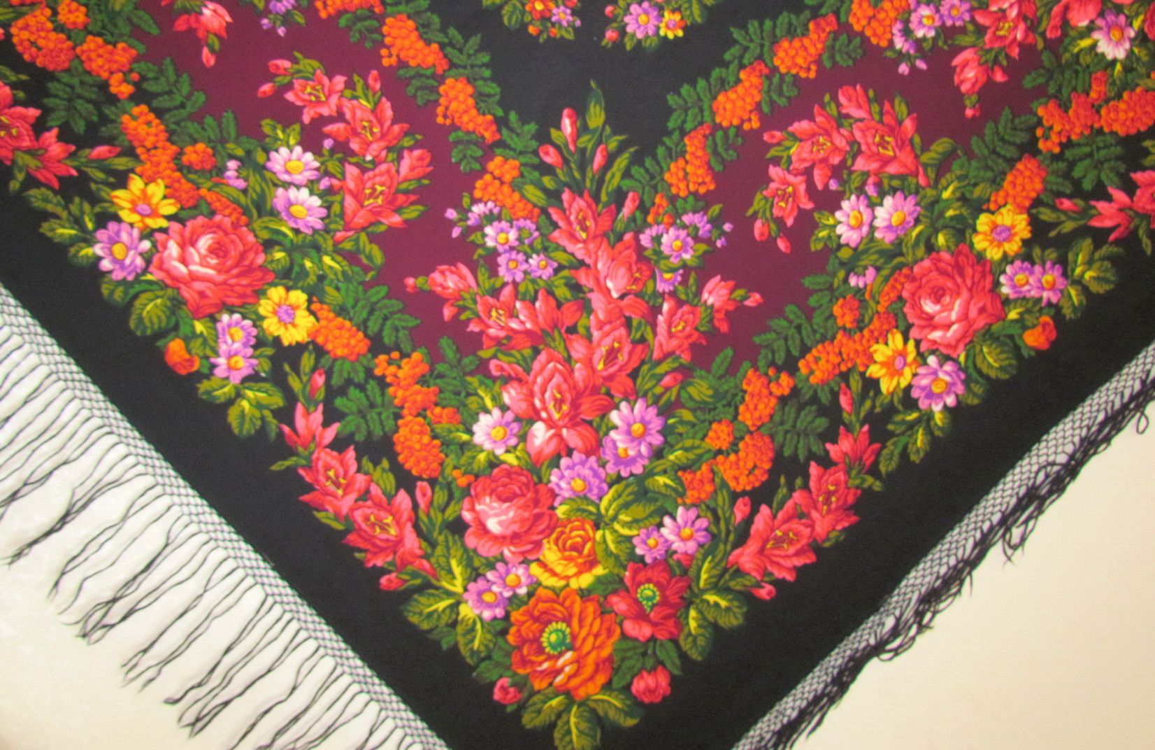Сегодня шла на почту с настроением тучек на небе и ощущением московской летней духоты. Развернула посылочку и повеяло осенней прохладой, солнце заиграло на ярко-оранжевых рябинках, заалели колосья гладиолусов, засверкали лимонные хризантемки...Я бы назвала этот платок Золотая осень...