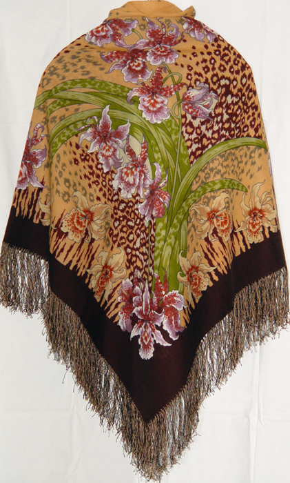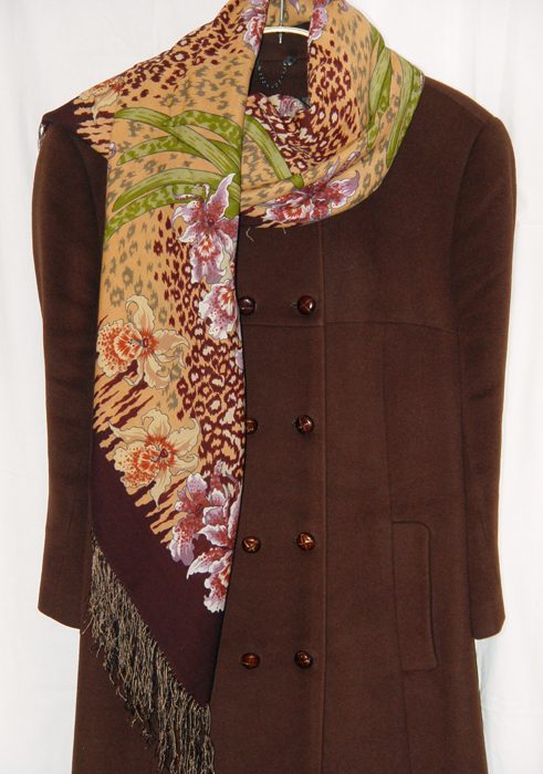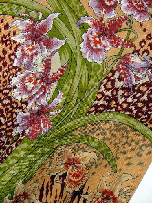 Дикая орхидея, рисунок: 850-67. На сайте он очень желтый, в действительности он приятного песочного цвета, вполне даже спокойного. Очень красивые цветы розово-лиловые. Не платок, а просто картина, можно разложить и любоваться. Очень хорошо смотрится в виде шарфа, т.е. если платок сложить несколько раз. Специально даю фото с пальто, чтобы лучше было видно, что он вполне носимый.
