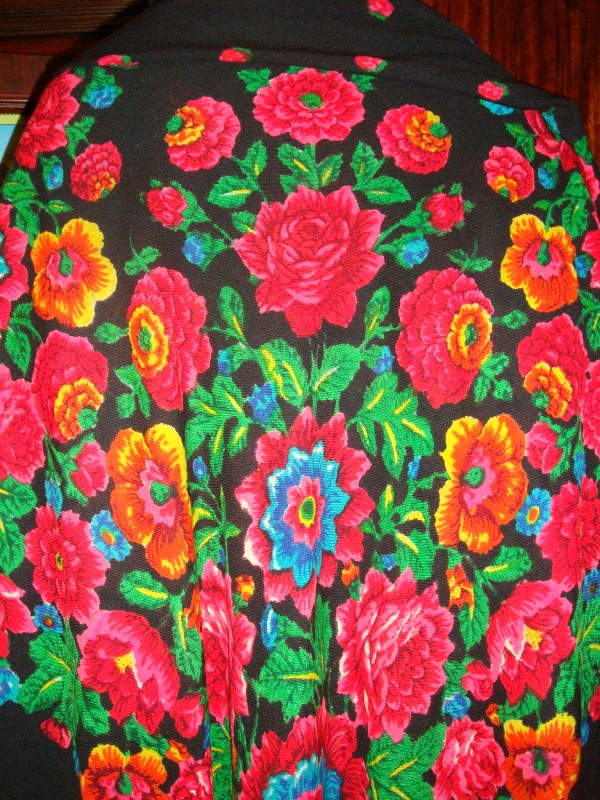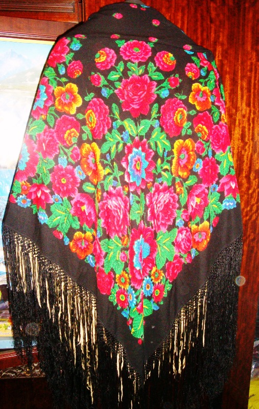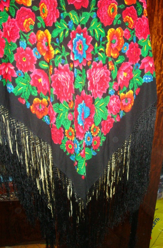Сохранность хорошая. Чернопольная, вся почти заполнена рисунком, довольно необычным, на мой взгляд, вроде бы цветы, но какие-то причудливые, стилизованные. Бахрома шелковая плетеная и очень длинная, примерно 35 см. Наверное, похожая бахрома на шалях для танца-фламенко. Очень красив платок с этой бахромой смотрится в движении. Но, увы, покажу только фото платка.