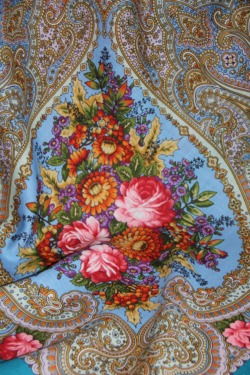 А это "Осенние кружева". В букете собраны осенние цветы и листья. Фон платка бирюзово-голубой.