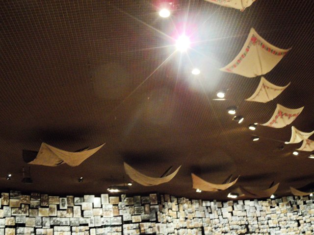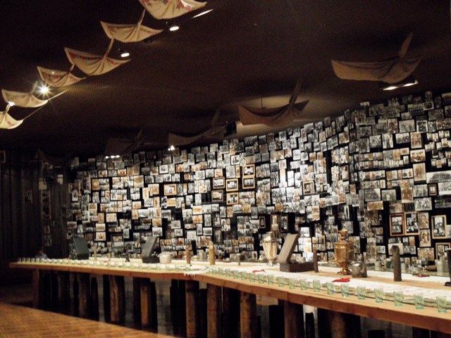 Это такой длинный, длинный зал, посреди которого такой же длинный стол. Стол несколько раз изгибается и уходит куда-то, куда не видно. На столе через равные промежутки стоят граненые стаканы -- да ведь это же поминальный стол, вдруг подумали мы одновременно. Вся левая стена сплошь из фотографий. А под потолком висят платочки. Мой друг тут же показал мне на них -- хотя я их увидела чуть раньше, чем вошла в зал -- и добавил: платочки скромные, не то что девушки носят сейчас. Платочки и правда скромные, хлопковые. Я смотрела на них и не могла узнать. Вроде Константин Аболихин в одном из платков померещился. Но всё-таки не знаю, и потому пришла за помощью в эту тему.