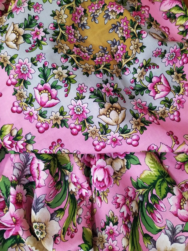 Да, каймы отрезалось сантиметров 10-12, но из-за её ширины рисунок в намотку уходит весь, а тут цвета побольше останется при ношении. Я хотела бы платочек носить, а не "лежать".