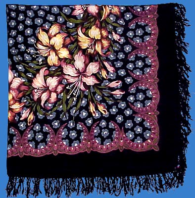 Этот платок очень напомнил мне шаль, которая произвела на меня неизгладимое впечатление году примерно в 1987-1989, когда я была ооооочень далека от павловопосадской продукции.На вечер встреч в школе пришла девочка из параллельного класса, всегда отличавшаяся от других во всех отношениях,одевавшаяся очень необычно и в то же время модно, дорого и элегантно, что тогда нечасто можно было встретить. И была она в черных юбке и водолазке и полушубке натурального меха, и сверху на ней художественно-небрежно был наброшен-намотан большой павловопосадский платок с шерстяной бахромой. Платок был черный, а рисунок был немногоцветный, всего в двух-трех цветах, именно таких, как на вашей фотографии. Меня тогда поразило, необыкновенно понравилось это сочетание розово-фиолетовых и золотисто-желтых роз и глубокого черного фона. Я даже какое-то время заходила в магазины, где продавались павловопосадские платки, надеясь найти такой, но ничего подобного нигде не увидела.