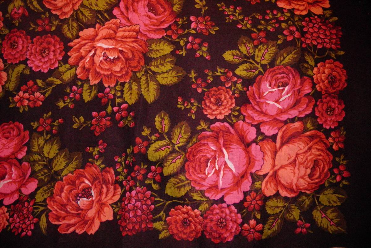 Я специально притащила платки к монитору - сравнить. На 14-й Цветочной сказке розы в реале не холодные чисто-розовые с переходом к белому, а чуть тепловато-розовые с коричневато-лиловым оттенком, а на зеленой фон значительно темнее и болотнее, листочки не серые, а зелено-серые в тон фону.