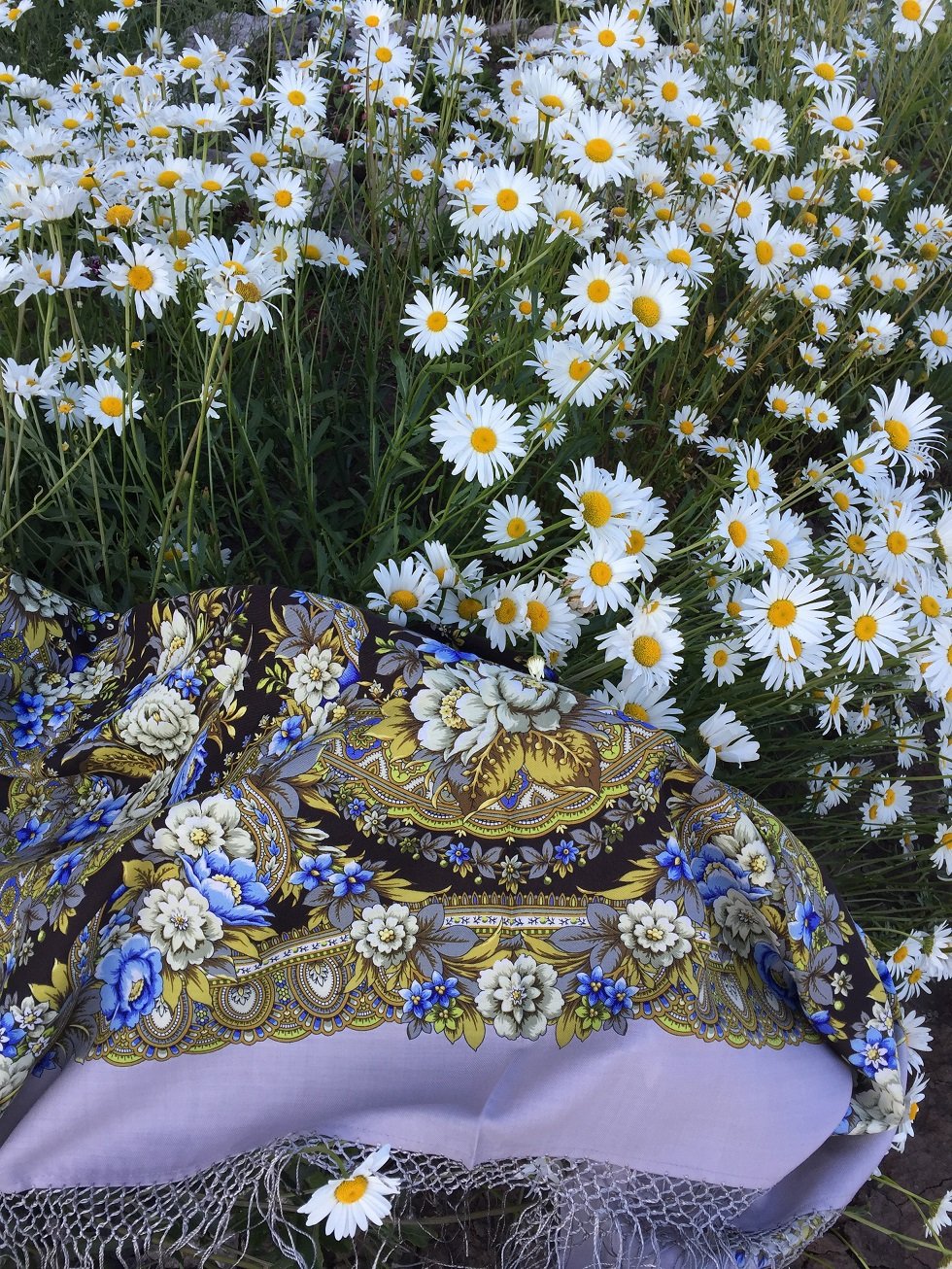 Примите и мой июльский букетик полевых цветов. И крепдешиновый платок Любимая полянка, на рисунок которого, как будто, перепрыгнули цветы из моего букета.