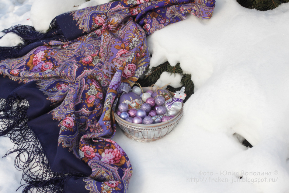 А Зарина, наоборот, эффектно поиграла яркостью красок на белом фоне Медальонов, подобрав очень подходящин по цвету игрушки. Даже удивительно, что существуют игрушки, настолько точно повторящие цвета шали.