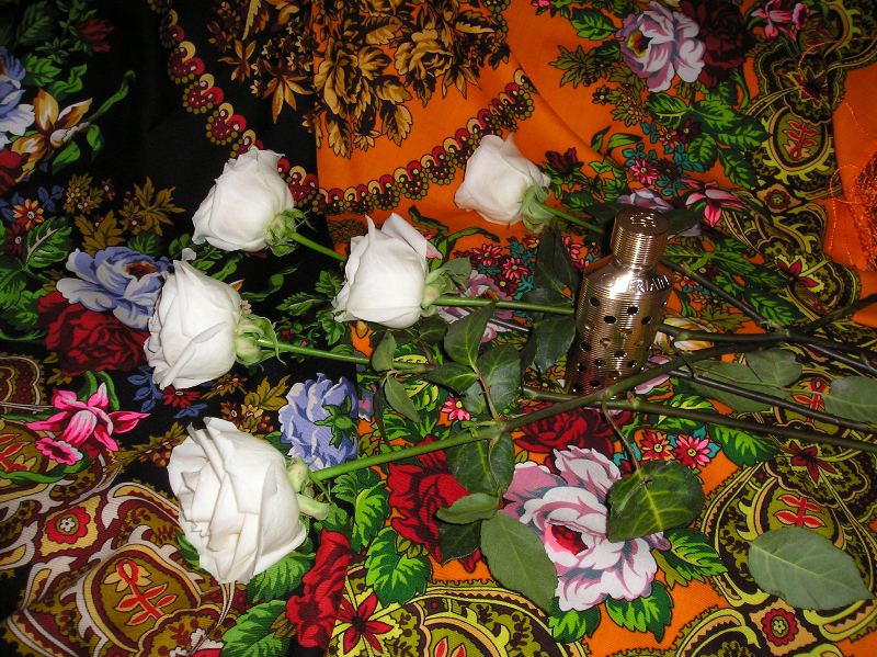 Настоящие белые розы на фоне "Белых роз" - можно сравнить на каком колорите белые розы ближе к истине))). Мне эта шаль нравится еще и на синем фоне, но троих Боливар точно не вынесет