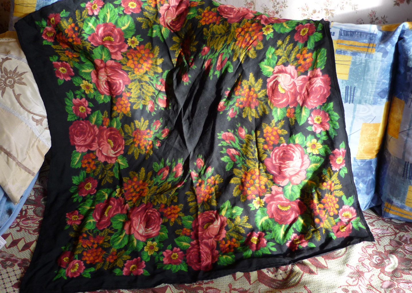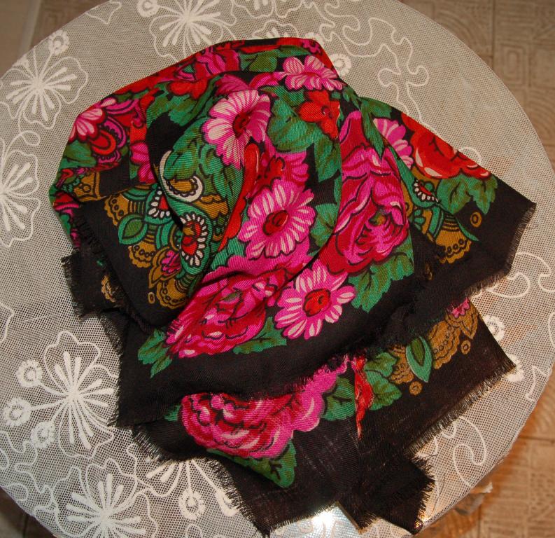 Iра81, очень интересный и красивый платок! Какого он размера? Очень понравилось (особенно это заметно на первой фотографии), что при всей традиционности расцветки платок хоть и выдержан в павловопосадском колорите (черный фон-розовые-красные цветы-зеленые листья), но нет крикливости, ядрености, схематичности в цветах. Очень светится роза на первой фотографии, почему-то при взгляде на Ваш платок в памяти всплывают жостовские подносы.