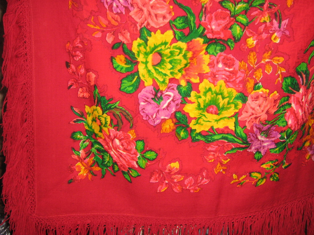 Прошу помощи клуба знатоков!))) У хозяйки светлопольного "Вечернего" есть еще вот такая вишневая шаль. Хозяйка (к слову сказать, очень приятная дама) говорит, что шаль точно павловопосадская, покупалась давно.