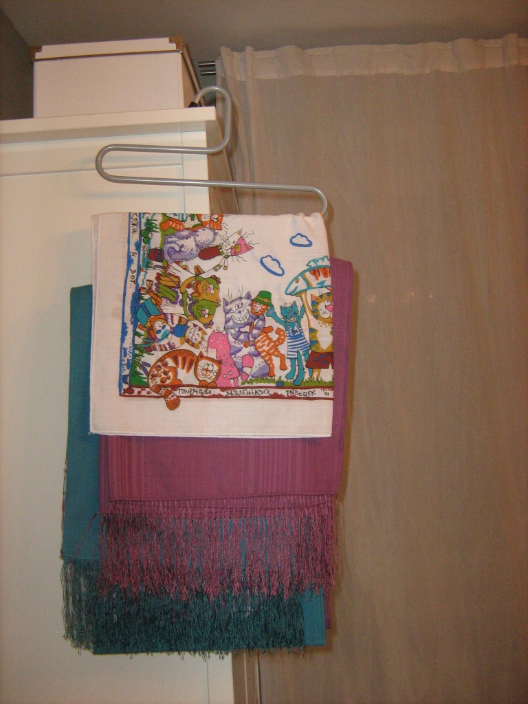 Точно! Только, мне кажется, не имеет смысла вешать на них маленькие платочки. А у шалей одна бахрома сколько места на полке занимает, да еще и помяться может.MarinaPev. писал(а):tig-rik, Вы предлагали такой вариант?
