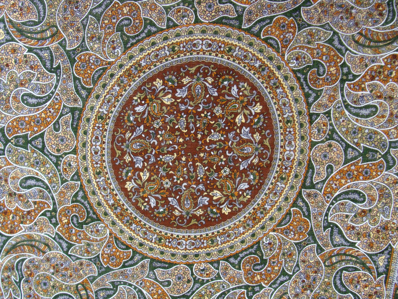 Думаю, первые впечатления не совсем точны, в комнате темно и горят энергосберегающие лампы, а они очень искажают цвета. "Небесный" оказался более зеленым, чем ожидала, т.е. фон конечно черный, но листики светло зеленые и фон под каймой серый немного с болотным оттенком, и эти зеленые листики оказываются самым ярким цветом на платке, поэтому и кажется он зеленее. Красиво, но неожиданно, надо привыкнуть.