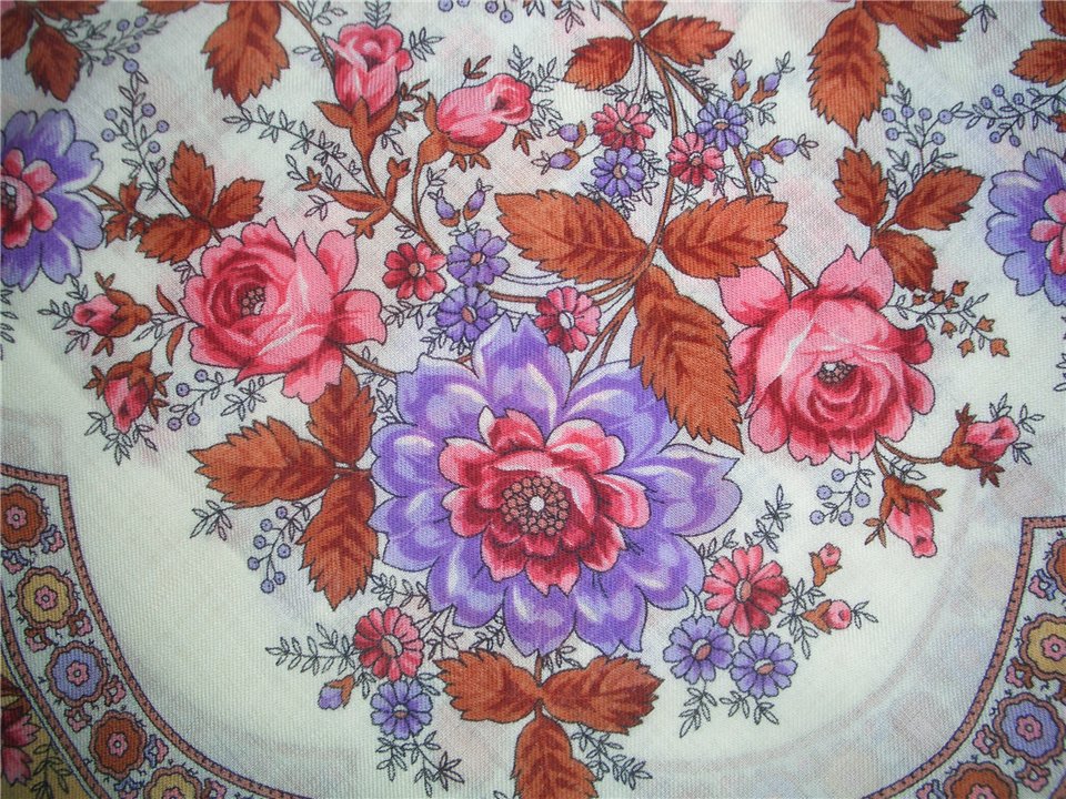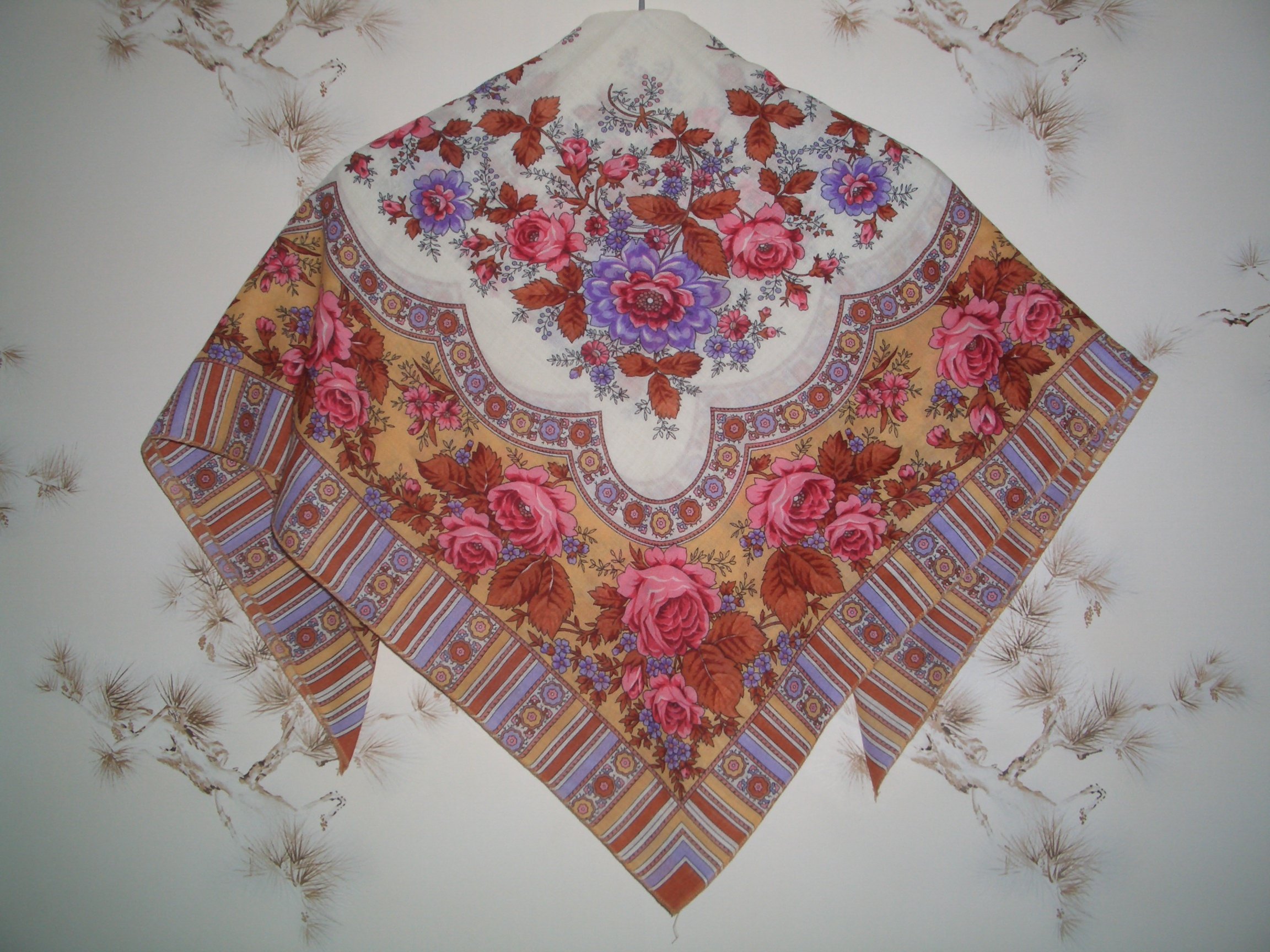 Рассматривая этот платочек в каталоге, а особенно в теме "Утечка информации", боялась, что фон опять окажется горчичным. О радость! - горчичного в нём ничего нет. Очень приятный светло-абрикосовый. На фото получился чуть желтее, чем в жизни.