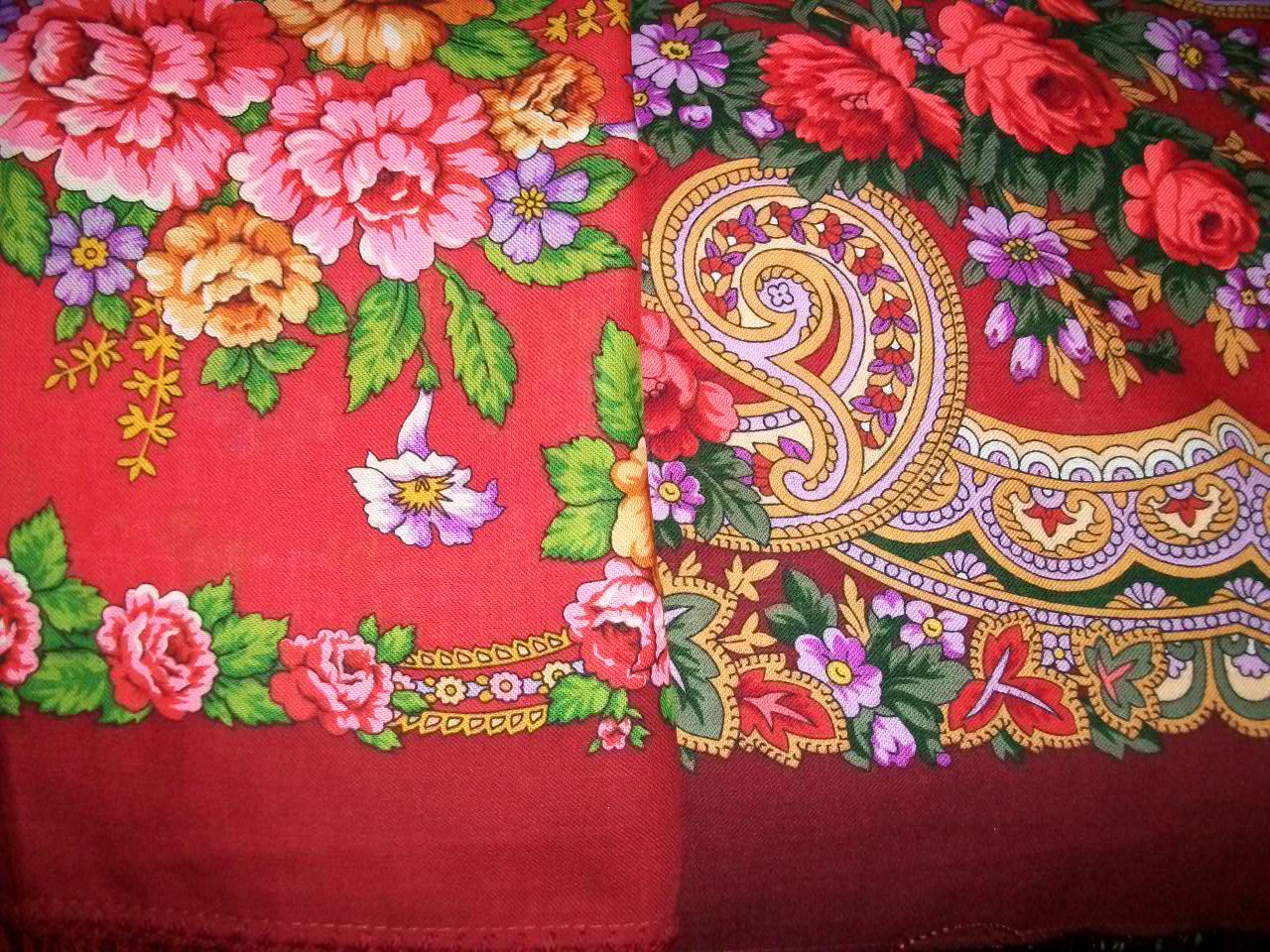 Разрешаю сама свои сомнения. Приехала ко мне все-таки "Мелодия любви"-17 и сравнила я ее с "Майей"28. Почему-то заочно они казались мне похожими. Вот положила рядом - общего лишь то, что обе они павловопосадские шали