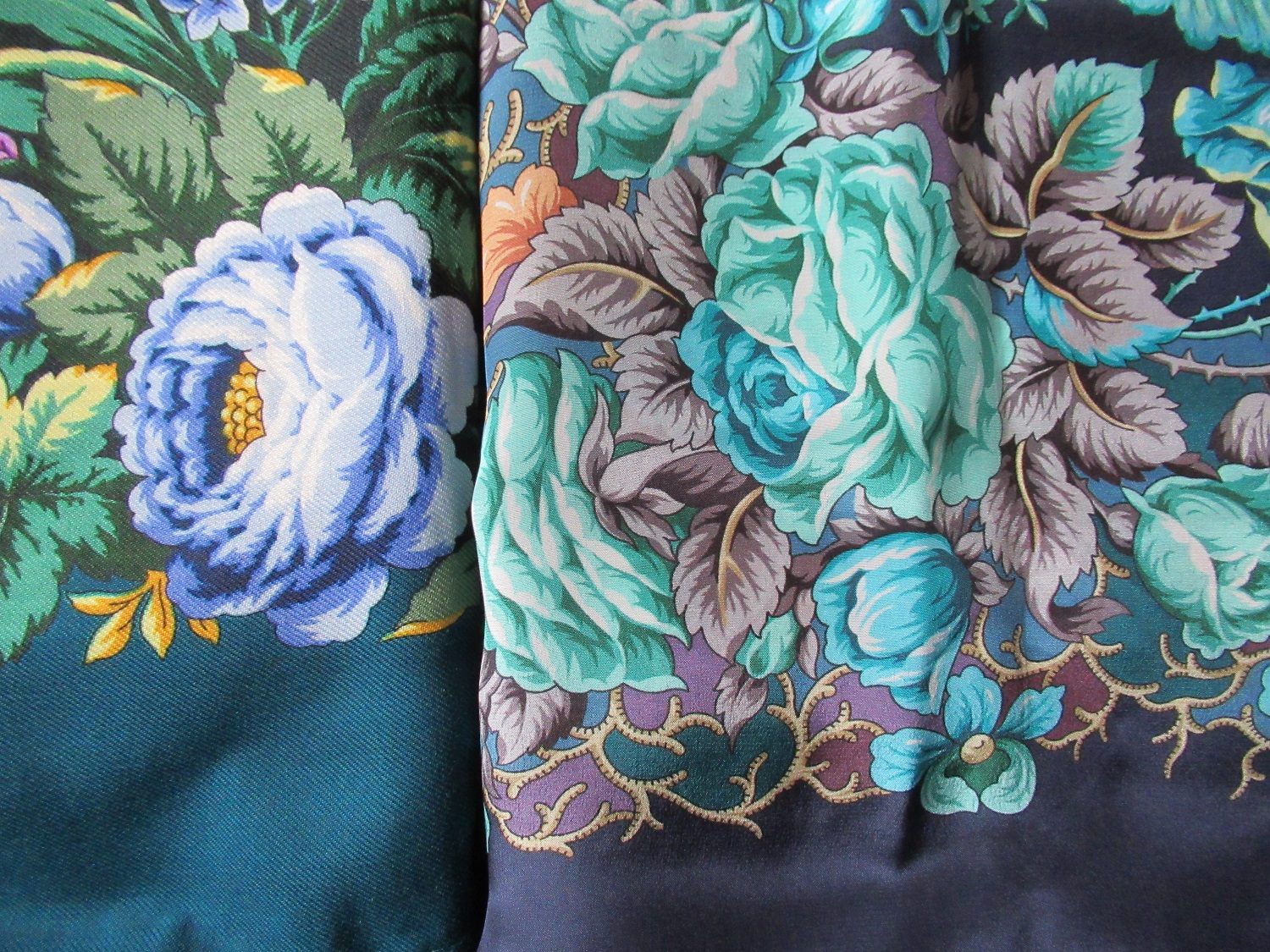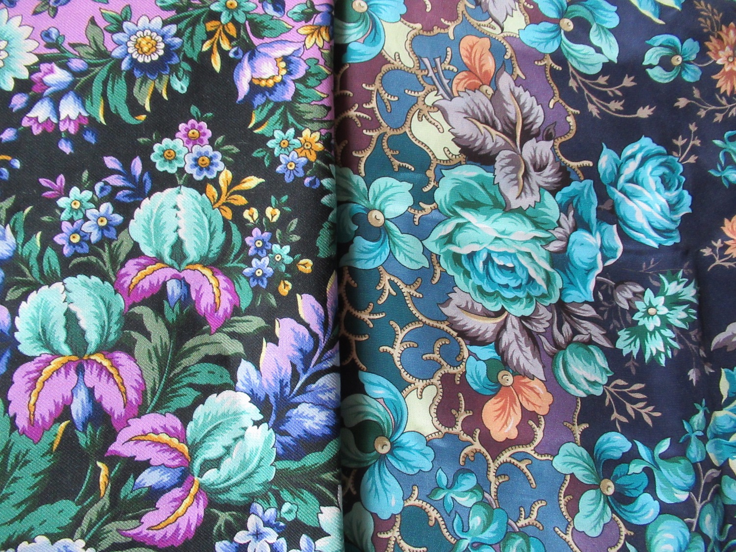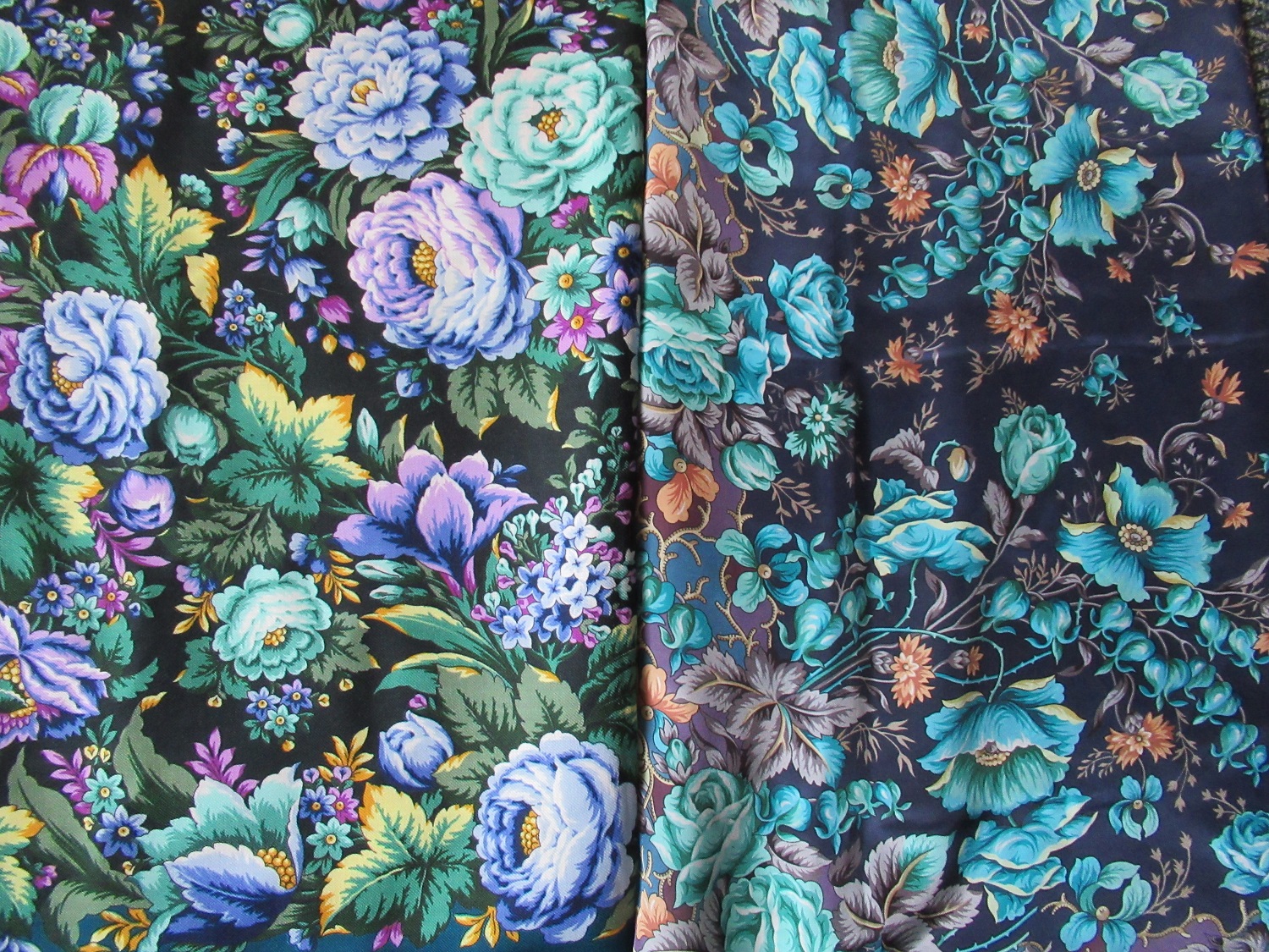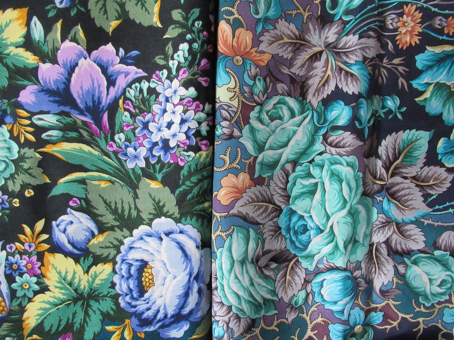 Moon River, спасибо! Это я просила сравнить. Они таки перекликаются ультрамариновыми розами, лепестки ирисов и пятилепестковых цветов (орхидеи?) похожи. Придется оба брать! Ирэна, Вы приняли правильное решение- оба красавцы, и явно родственники!