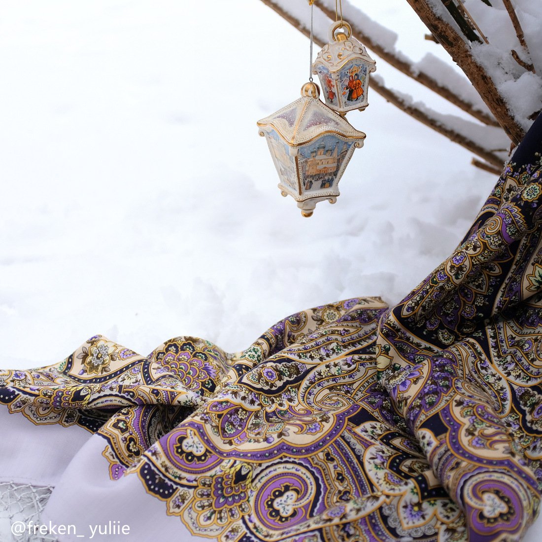 Девочки, большое спасибо за добрые слова и хорошую оценку. Очень рада. Немного нервно всё это фотографировалось, получилось, естественно не совсем то, что задумывалось. Довольно сложно снимать такие композиции на улице. На собственном участке на даче - это нормально, там я сама себе хозяйка, никто не мешает, никто не смотрит. Разложи себе спокойно предметы красивенько, и сиди, жди подходящего света, хоть сутки, потом фотографируй спокойно, не торопясь. А в московском густонаселённом дворе совсем не так комфортно в плане съёмки. В общем, когда я резко осознала, что наконец-то выпал новый чистый снег, оказалось, что свет уже уходит, пришлось бегом собирать всё и бежать на улицу. Да и сам мой выход во двор с довольно крупными предметами - сверкающей ёлкой с шарами, огромной шалью, фотоаппаратом и лошадью под мышкой, вызвал нездоровый ажиотаж у моих соседей. В такой обстановке особо не разгуляешься с поиском разных ракурсов съёмки. Но, было весело. Несколько раз в снегу извалялась, пока снимала. Потом шарики под кустами собирала.