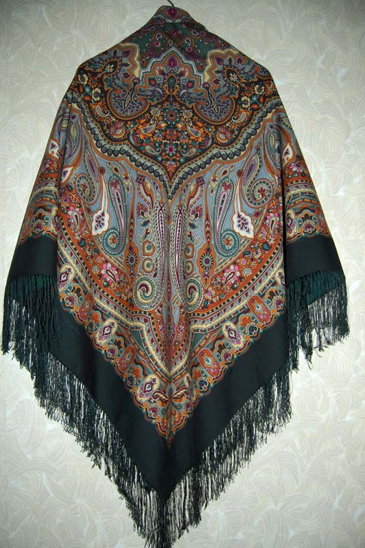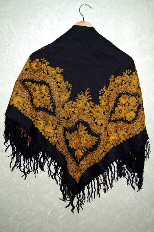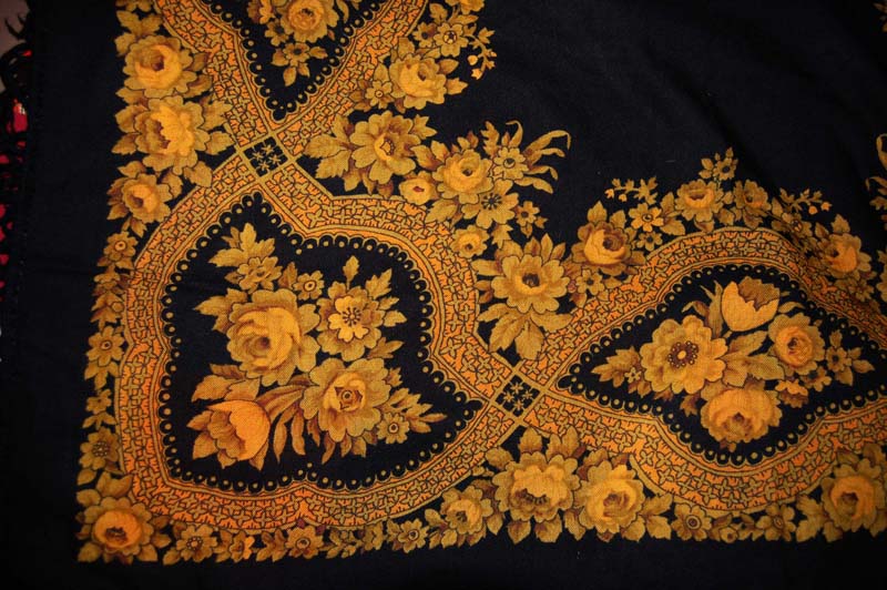 Мне мама отдала свой платок, который у нее уже много лет. Я не уверена, что это изделие павловопосадской мануфактуры, но может быть...? Бахрома шерстяная и очень уж похожа на павловопосадскую по способу крепления.