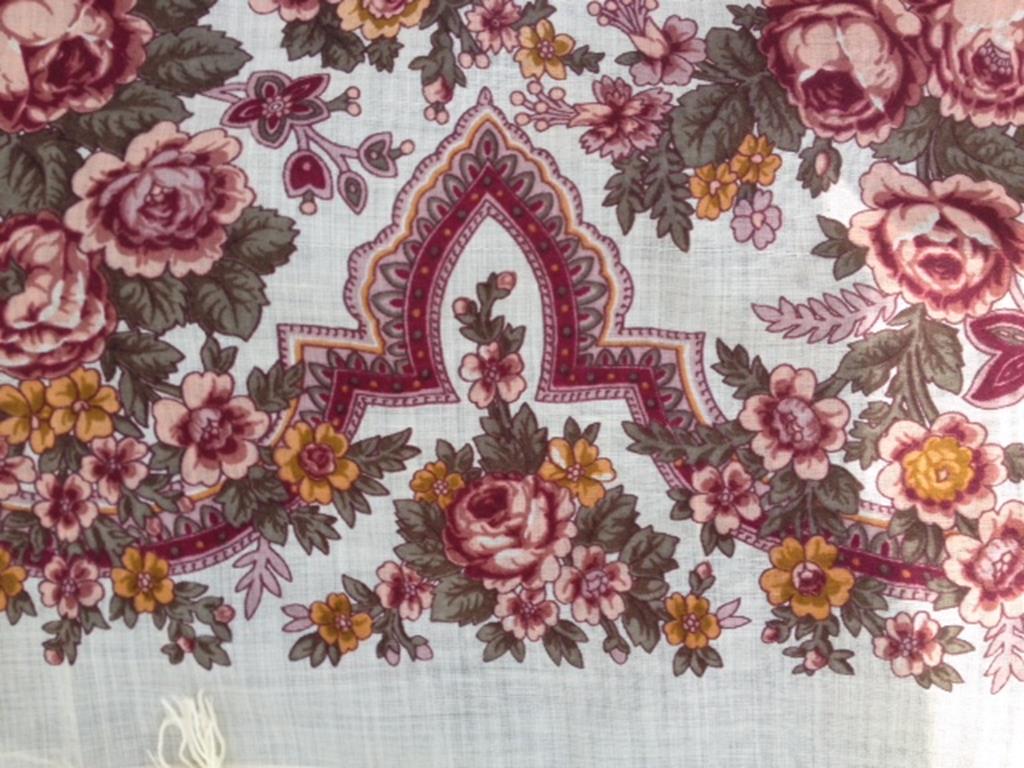 Шалелюбушки, хочу еще добавить, кайма платка нежно-кремовая,что прибавляет тепла этому колориту.И шерсть тоненькая,но не шелковистая, отличается от других платков 90 гг.Русская красавица драпируется легко и красиво.