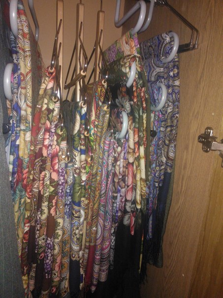 Сначала купила себе в дом, проверила - понравилось. А потом и у Юли сделали как у меня - все уплотнённые шали повесили по колоритам в шкаф в прихожей на такие же вешалки. Все довольны.