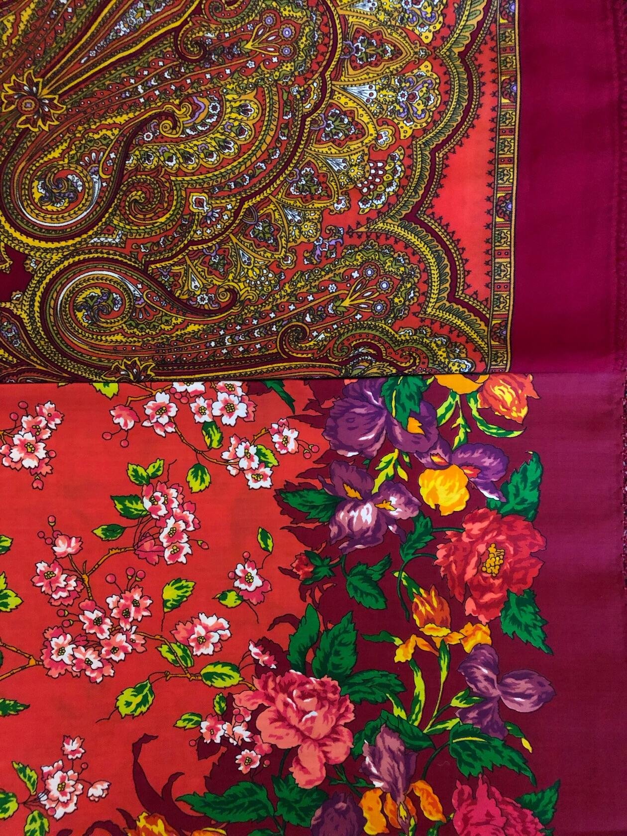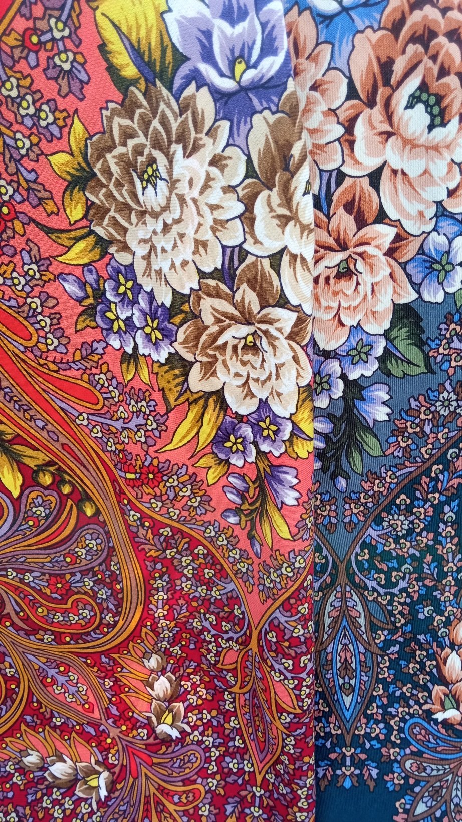 Хорошо видно, что платки кажутся вроде бы из одной истории, но НСВ чуть ярче, зелень чуть другая, синева чуть менее полуночная, рыжина чуть более рыжая - в общем, две большие разницы :D