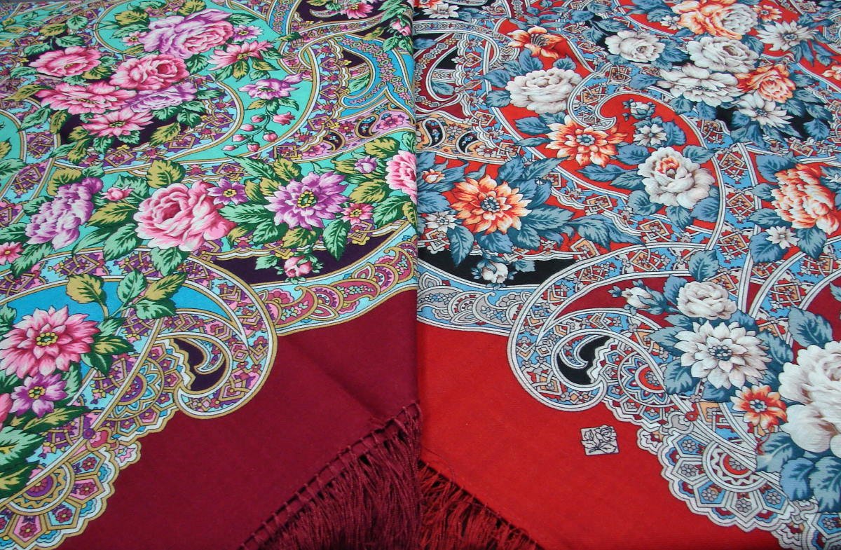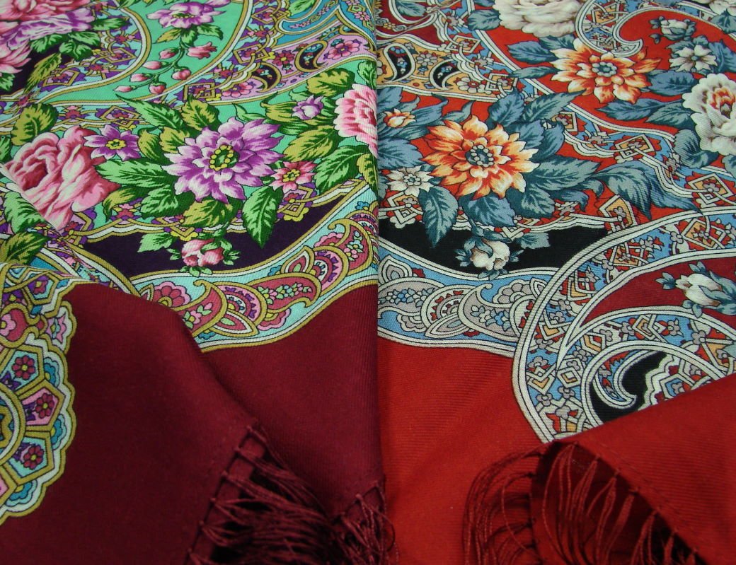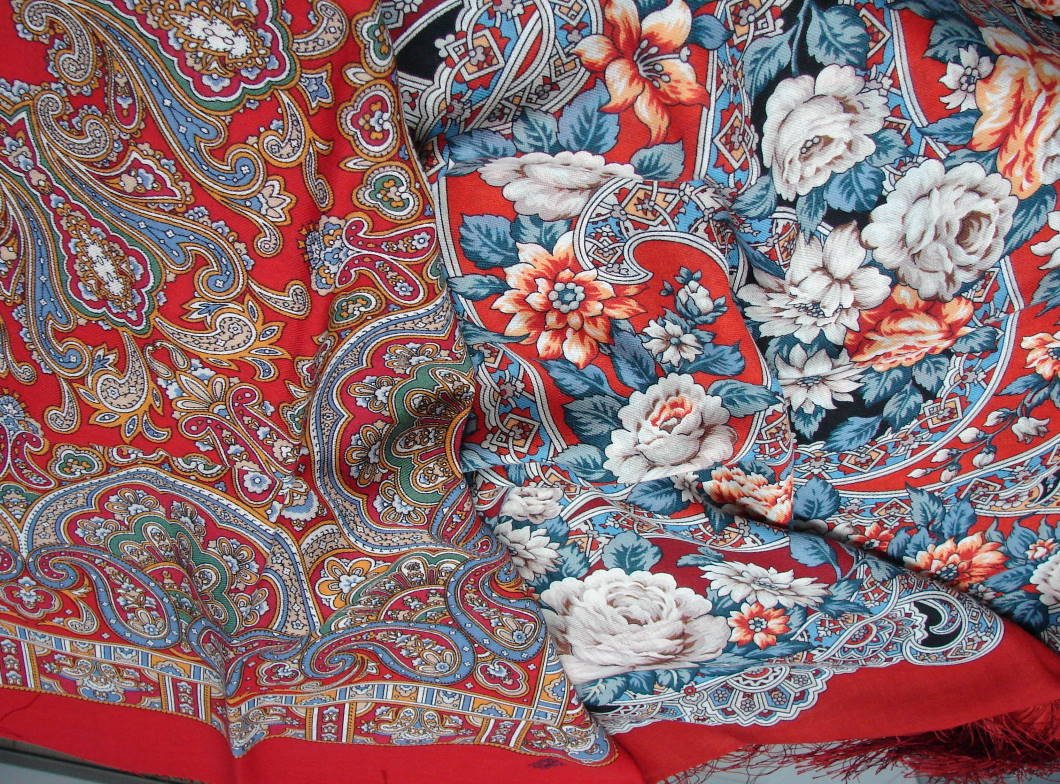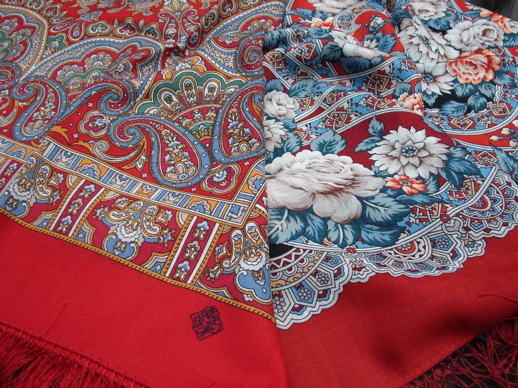 Со вспышкой, видно, что кайма на Улочках теплого красного цвета: Рисунок в псевдодрапировке: Улочки светлей, но вот есть на нем крупные рыжеватые цветы, могут выдать неожиданную рыжинку, Танец такого не сделает. И углы без вспышки при холодном освещении в магазине. тут разница очевидна: Эх, какие завитки всё же на этих Улочках! Платок очень светлый и радостный вышел: кружевные ленты и серебристые цветы на ярком красном.