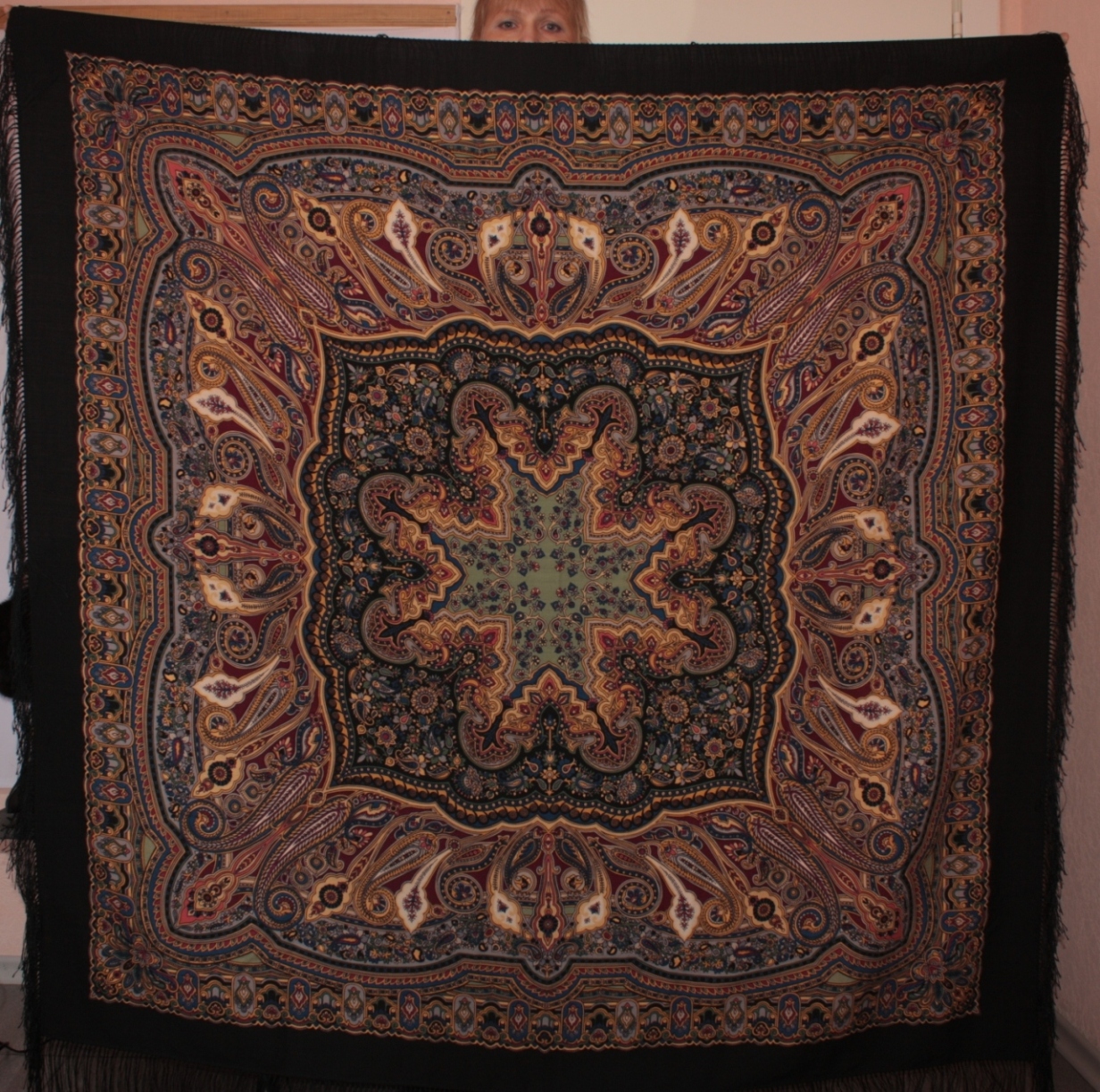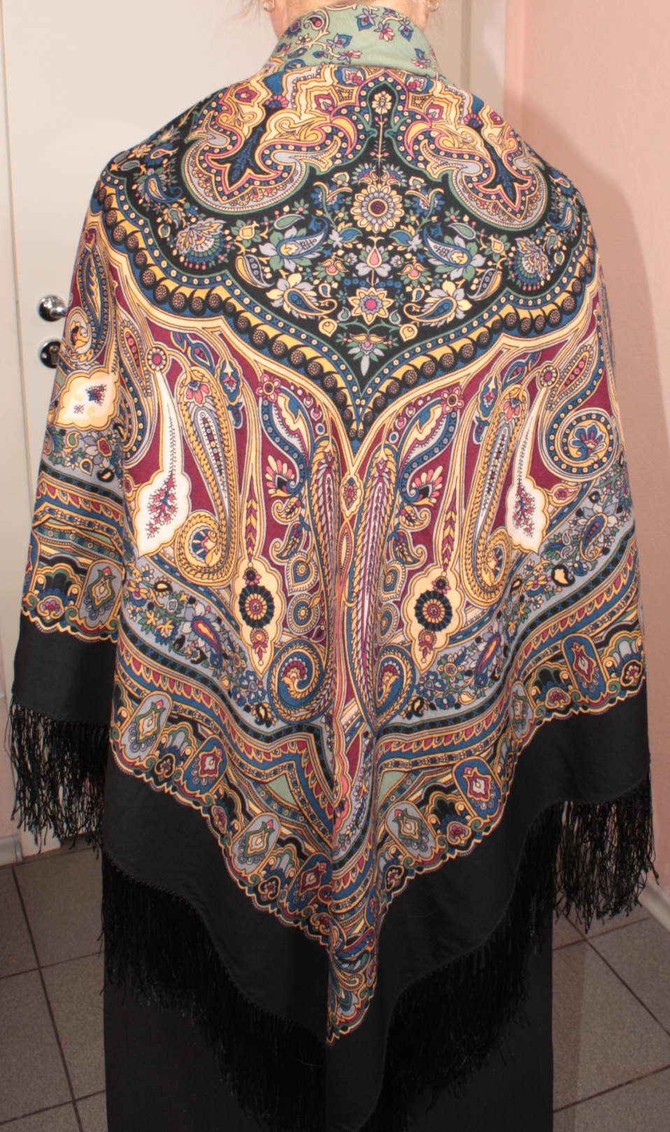 У меня есть "Русская красавица" с изумрудными розами. Постараюсь сфотографировать поскорее. Платок не новый, был отдан мне подругой, знающей, что я платки и шали люблю и активно ношу. Ко мне платок попал с уже слипшейся и несимпатично выглядящей шерстяной бахромой. Вот как раз подумываю, не реанимировать ли бахрому...