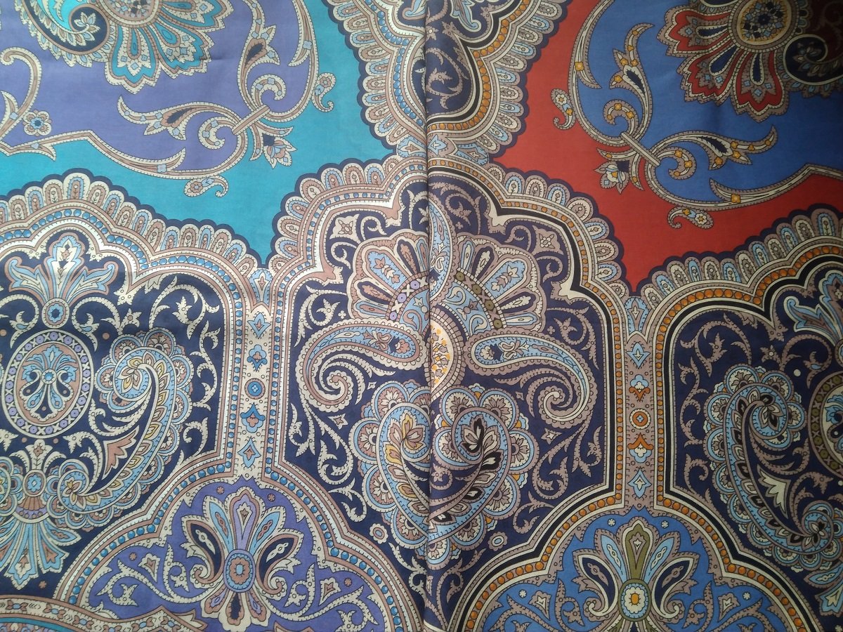 , но шаль справа выглядит как будто чуть темнее, но при этом насыщеннее и контрастнее. Голубая середина особенно.