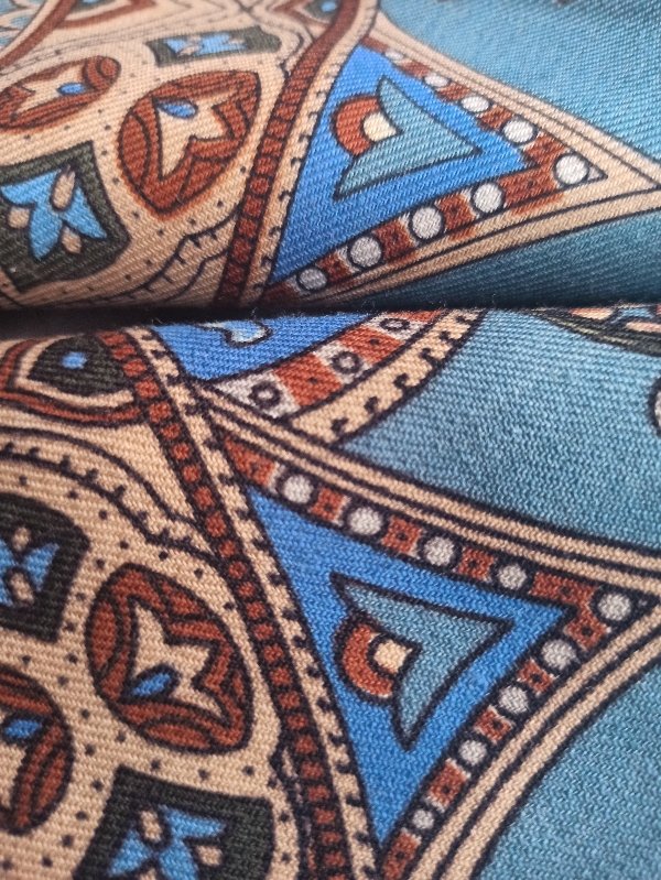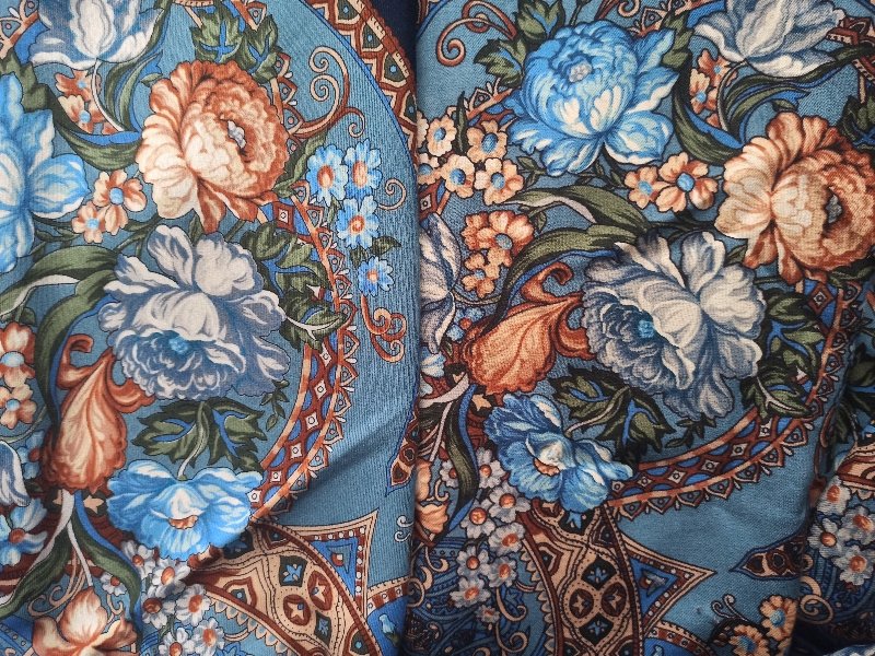 На фото откуда-то появился зеленоватый оттенок, его там нет, ну или почти нет. Основные голубые оттенки на обоих платках, практически, идентичны, разница, кмк, обусловлена качеством ткани. На новом платке ткань шелковистая, на старом - шершавая. За счёт толстого контура старый платок контрастнее там, где цвета одинаковые, но есть и действительные отличия по контрастности, например, в исполнении цветочков, новые немного смазаны. Светлый коричневый цвет на новом немного теплее, зелёный тоже, но в целом платки выглядят одинаковыми.