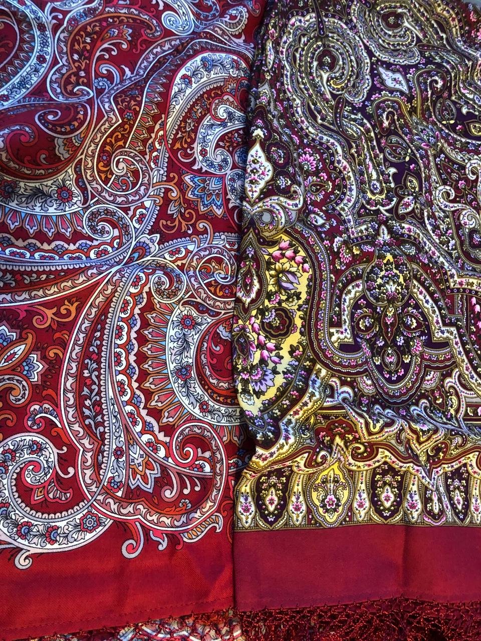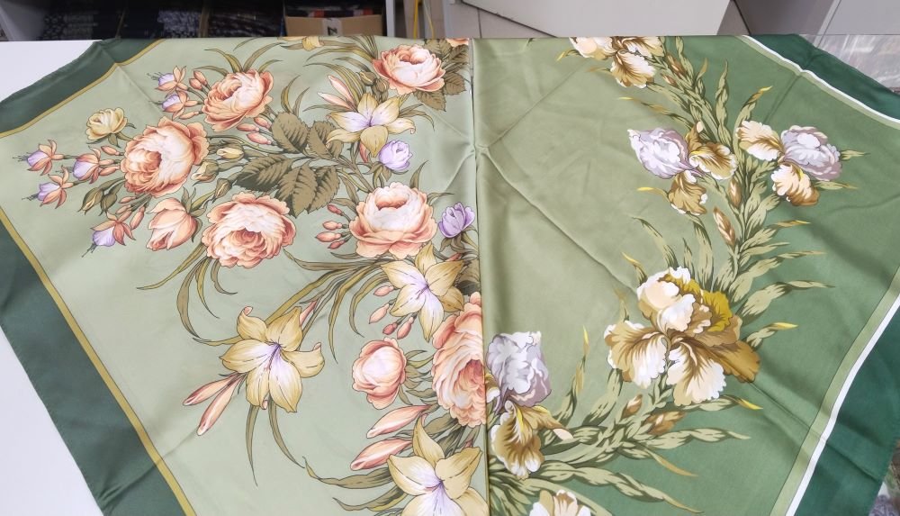 Прошу прощения, платки сняты с витрины и немного помяты, свет магазинный, а фото на телефон, атлас ещё и бликует, но общее впечатление составить можно.