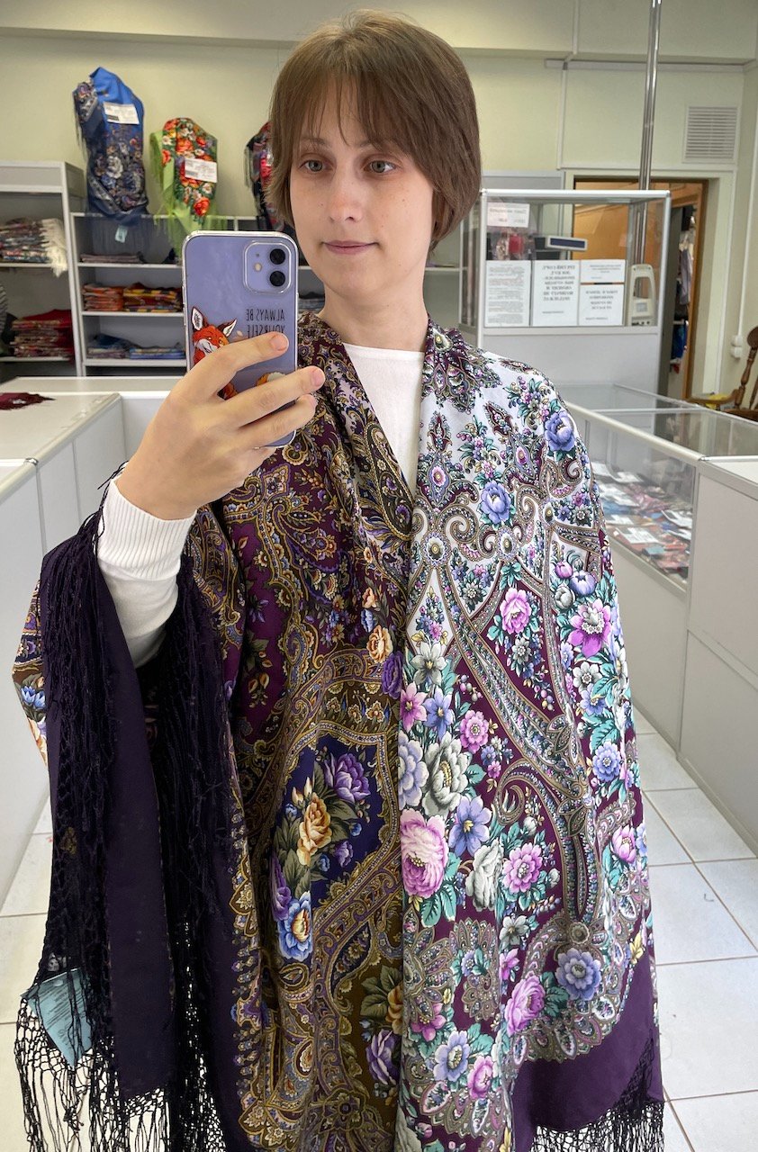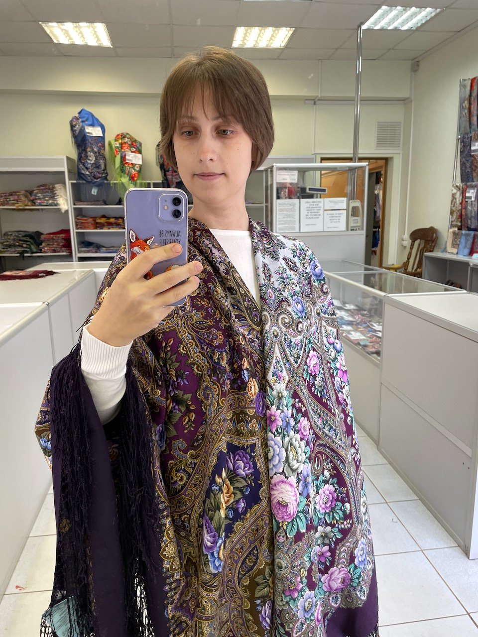 На плечах. Из этой пары мне "Свет мой, зеркальце" больше понравился, но накинула ради интереса. Слишком насыщенный баклажан мне ещё рановато.