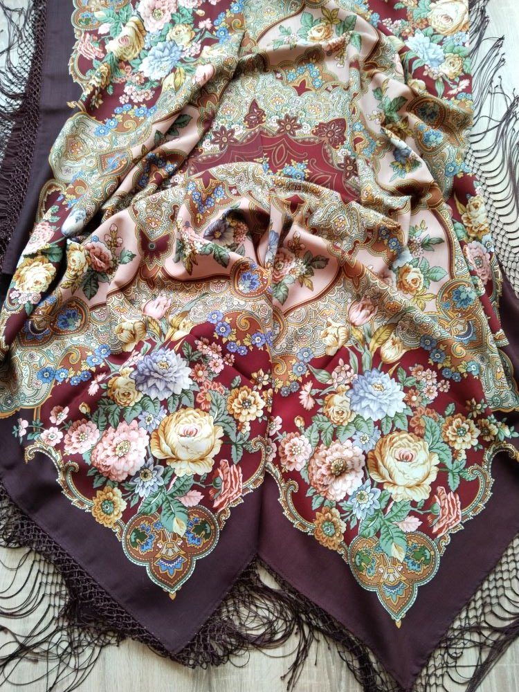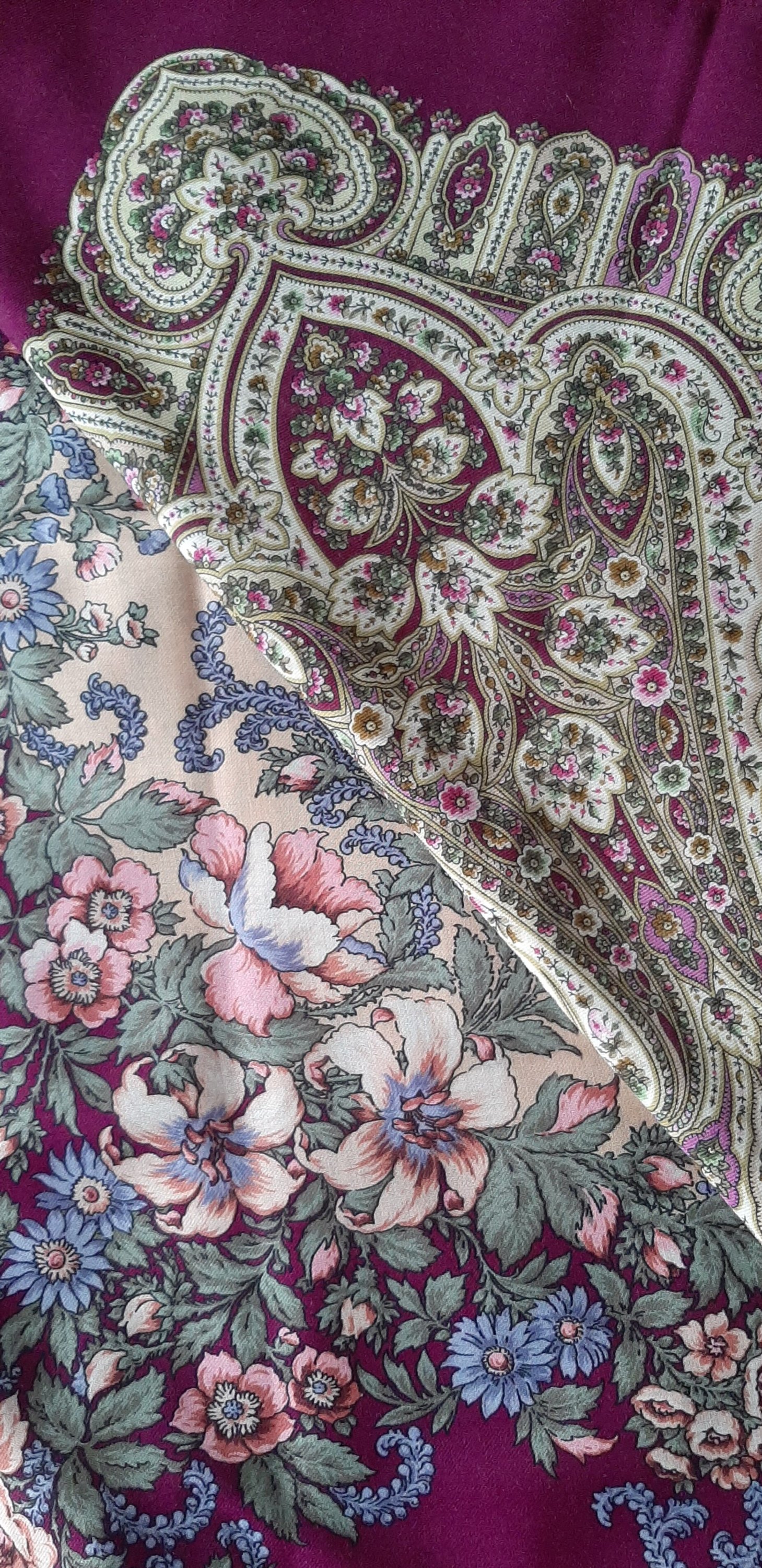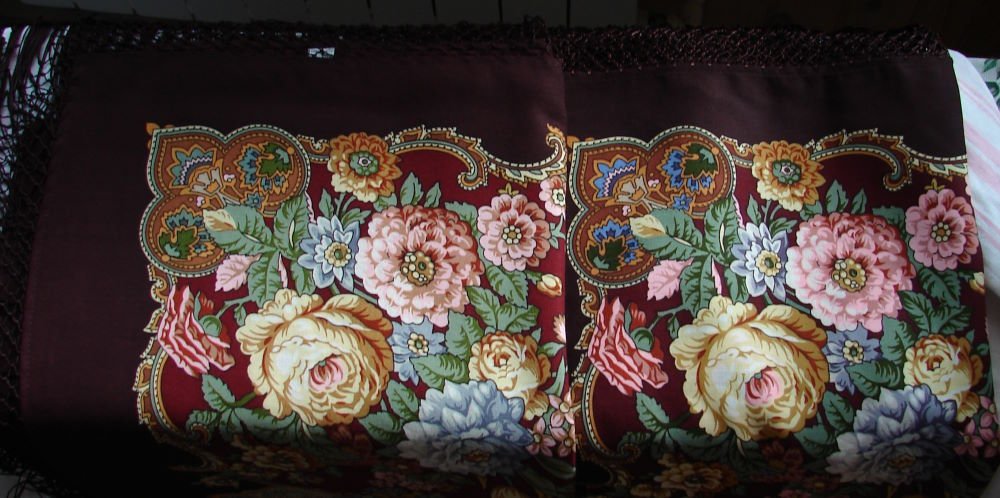 Решила сравнить "Вечерний сад" Т.Сухаревской и "Сны белых цветов" В.Фадеевой. Платки 15-го колорита. В архиве очень мало фотографий этих платков.Снимки сделаны при дневном освещении. При искусственном освещении насыщенный ягодный цвет становится ближе к фиолетовому. "Вечерний сад" очень люблю и так часто носила, что когда платок сняли с производства поспешила купить дубль.На мой взгляд, по цветовому решению у этого платка нет аналогов.