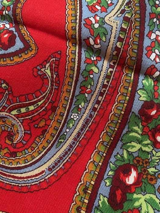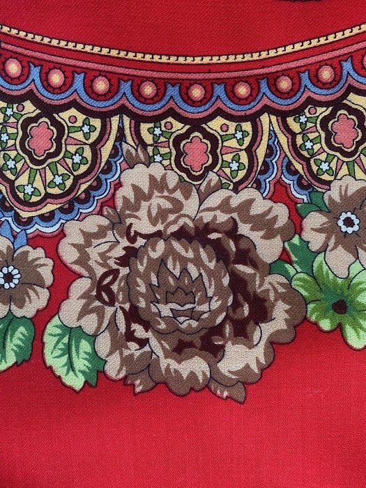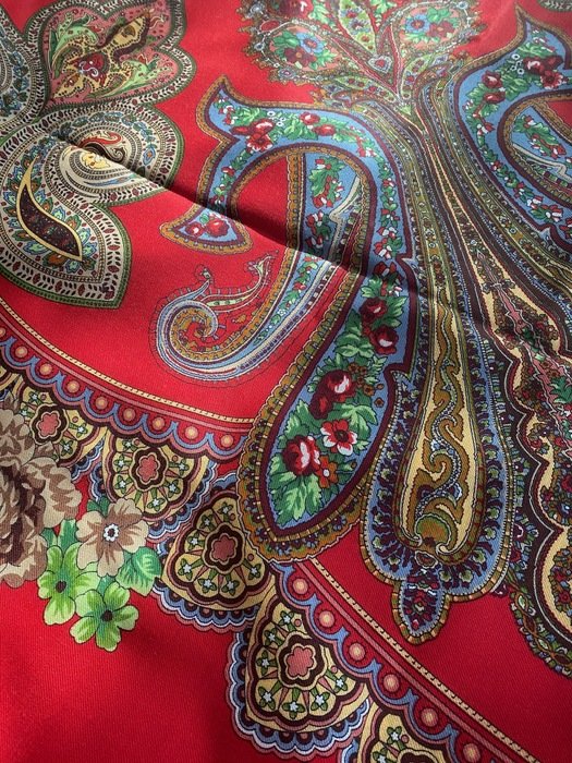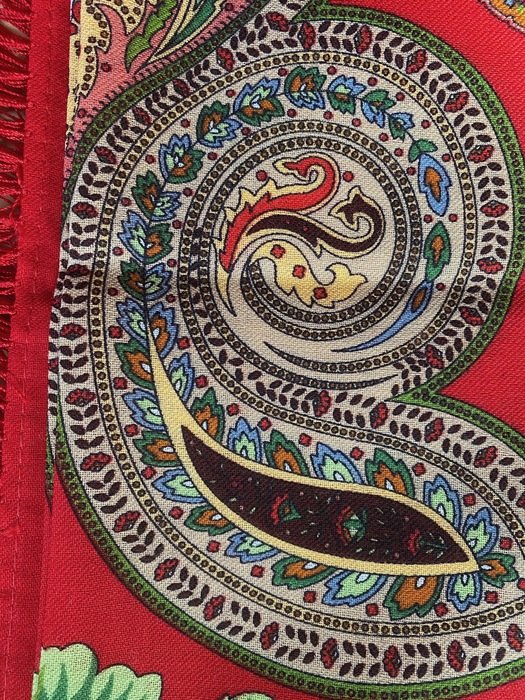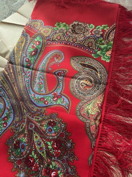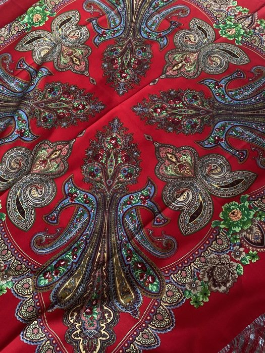 Платок красивейший не только своим рисунком, а главное цветом фона: не светлый, густой, классический красный, переливчатый, и ВНИМАНИЕ--меняющий оттенки! При разном освещении может быть очень разным!