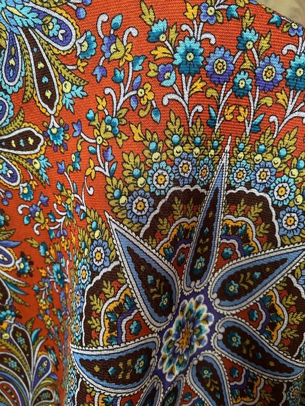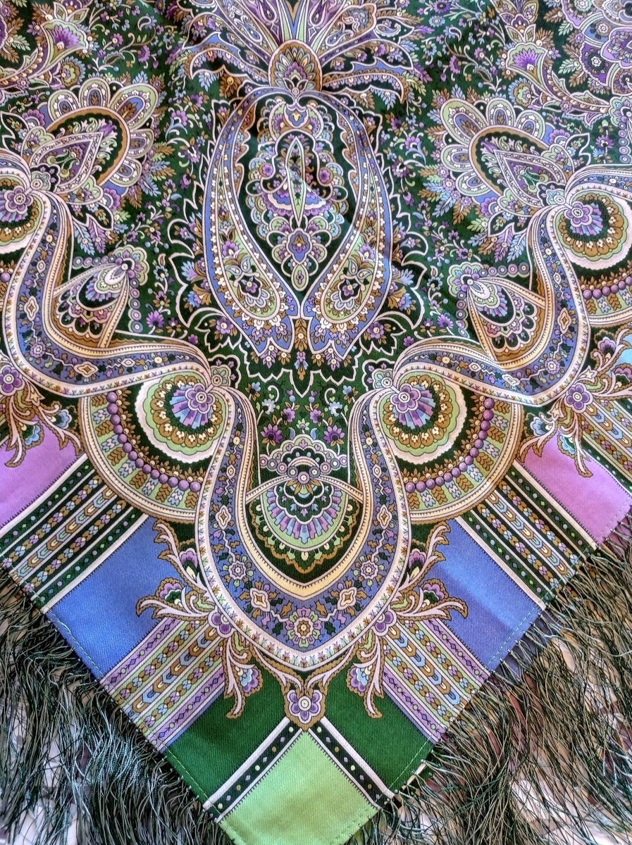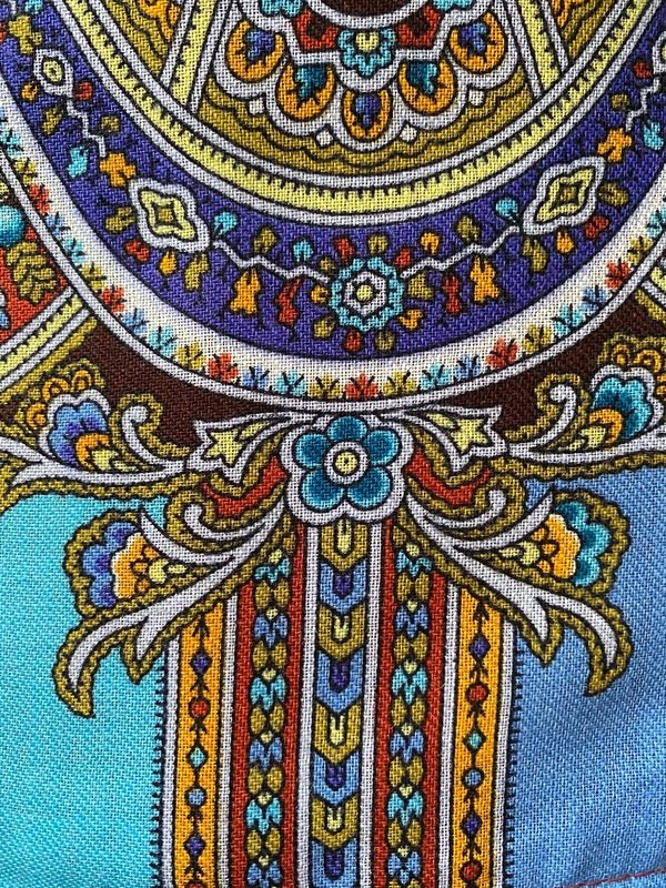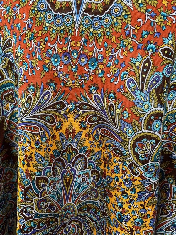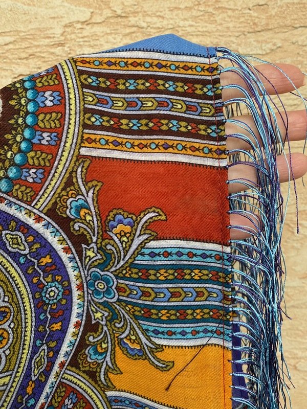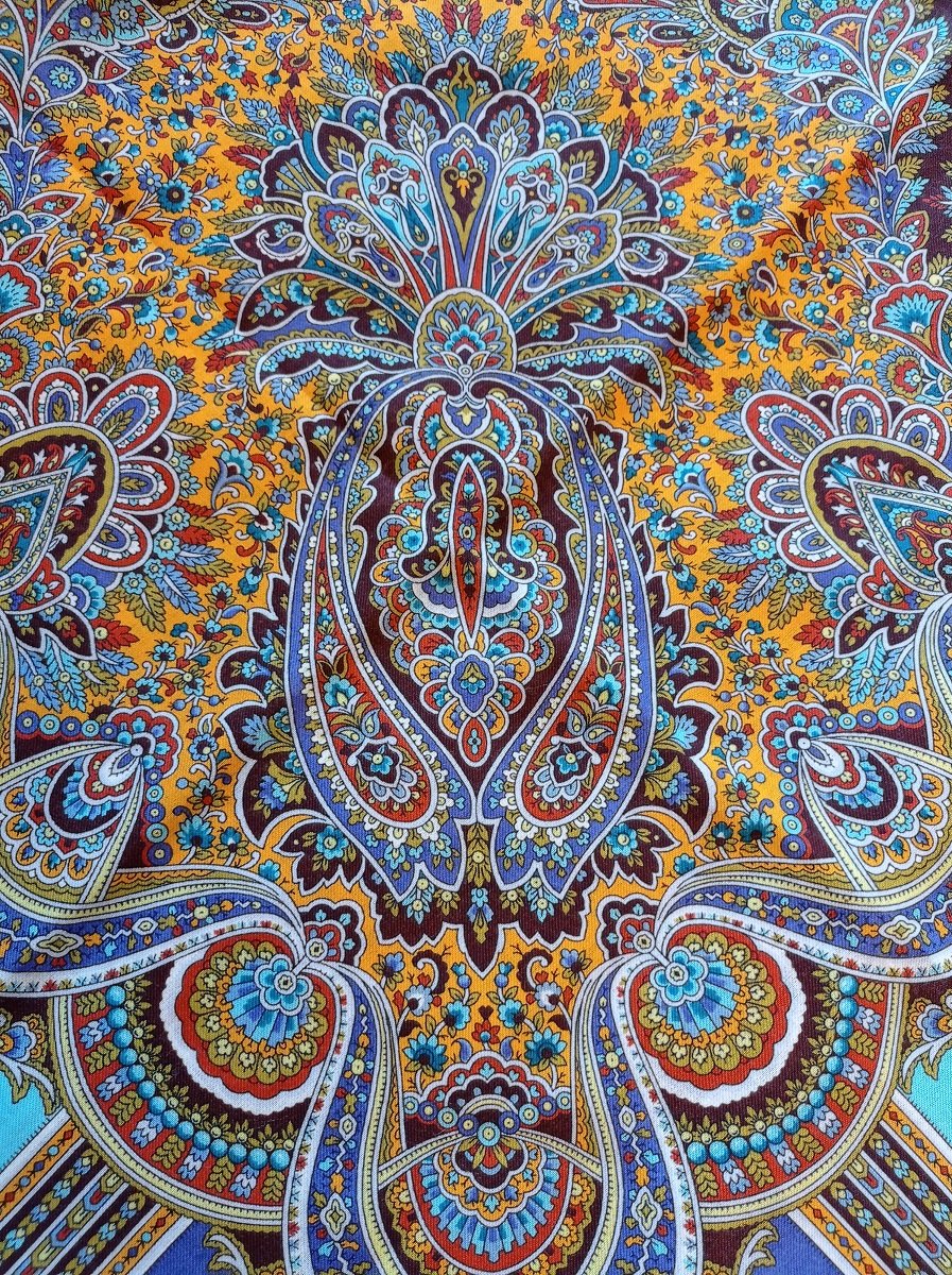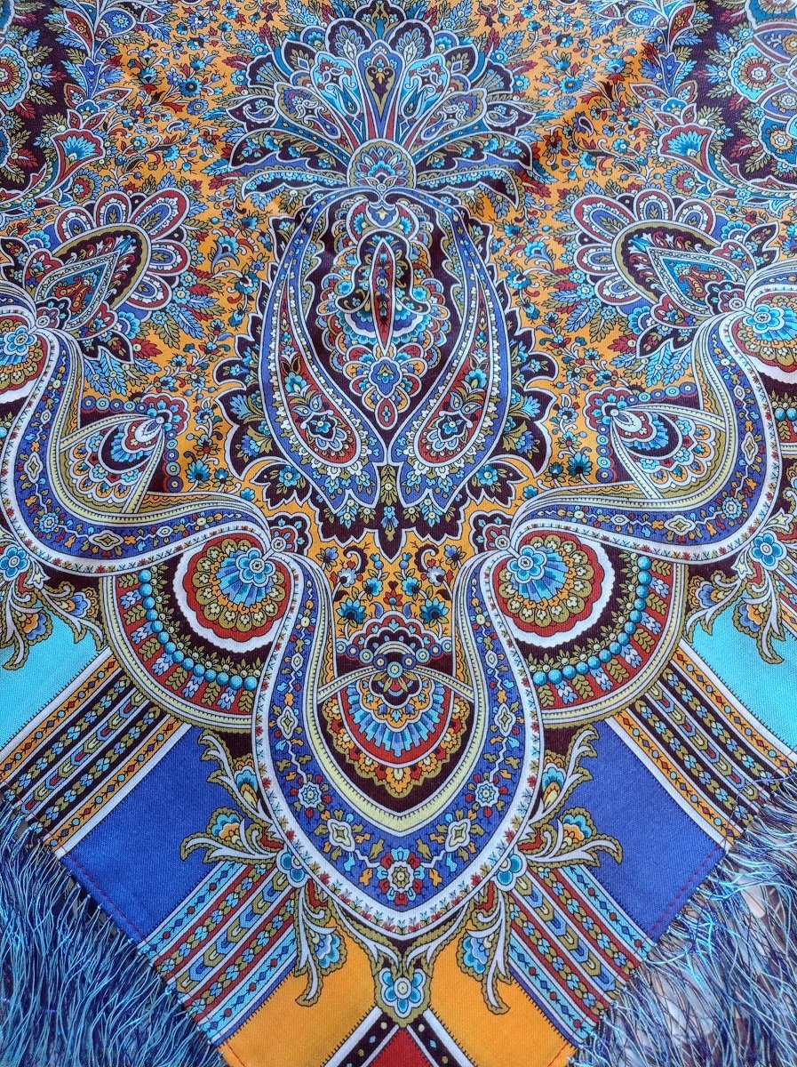 На фотографиях часто получается резким и чрезмерно ярким. По первому впечатлению--весь в целом, платок не оранжевый и не желтый. Он --голубой! Тона и полутона...Голубая синь, фиолетовые колокольчики. Самый светлый, голубой на кайме-- холодного чистого тона, льдистый и насыщенный. Мне показались все цвета синего--чистые, без примесей оттенков и "сложности". Красочный!