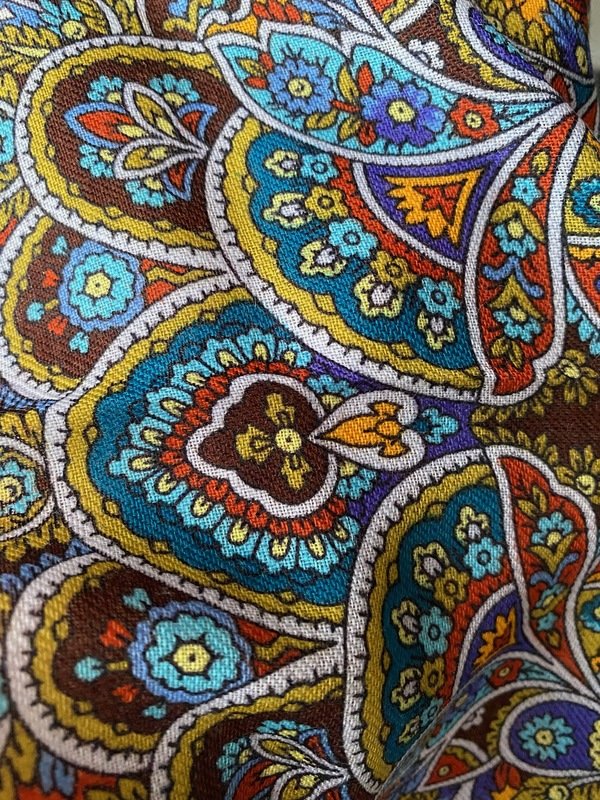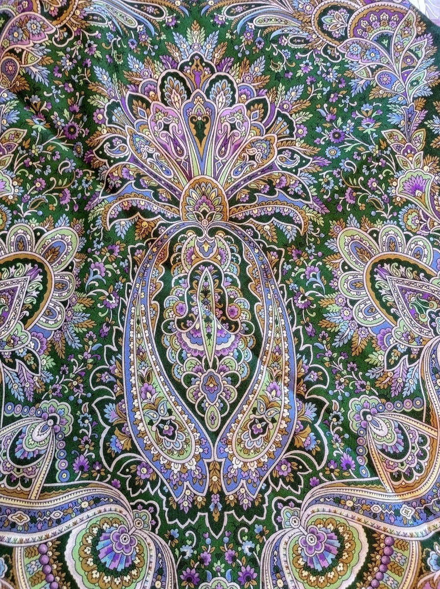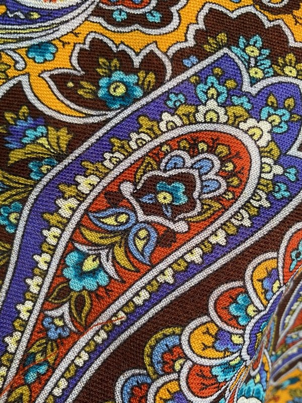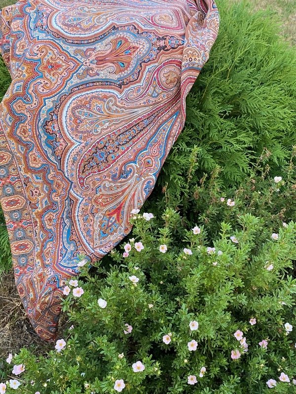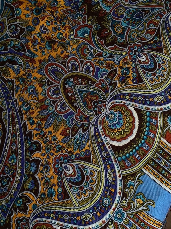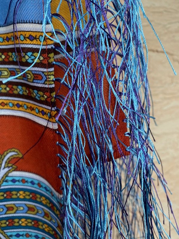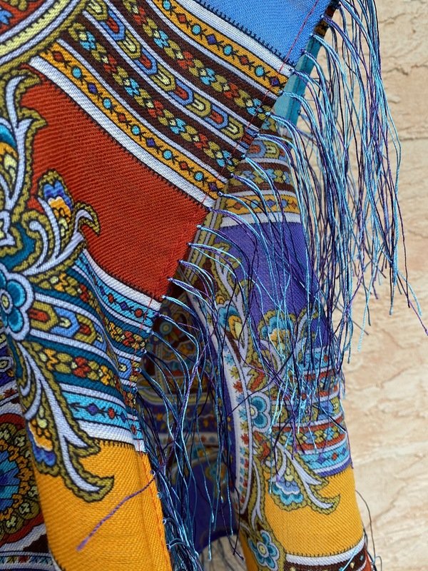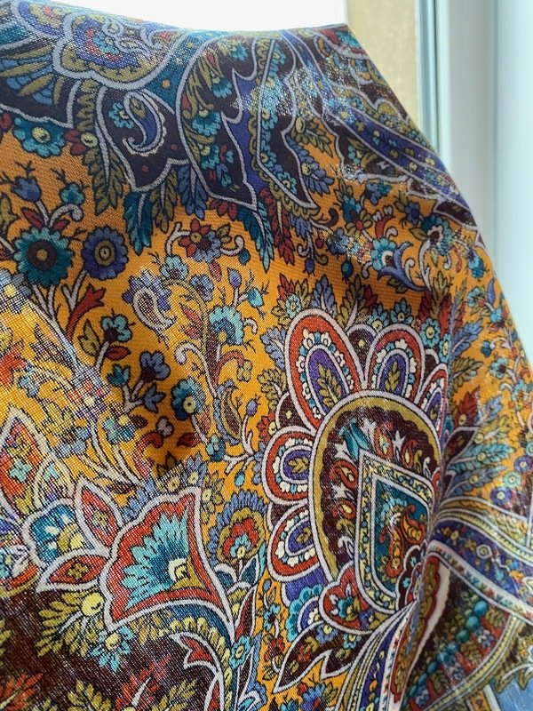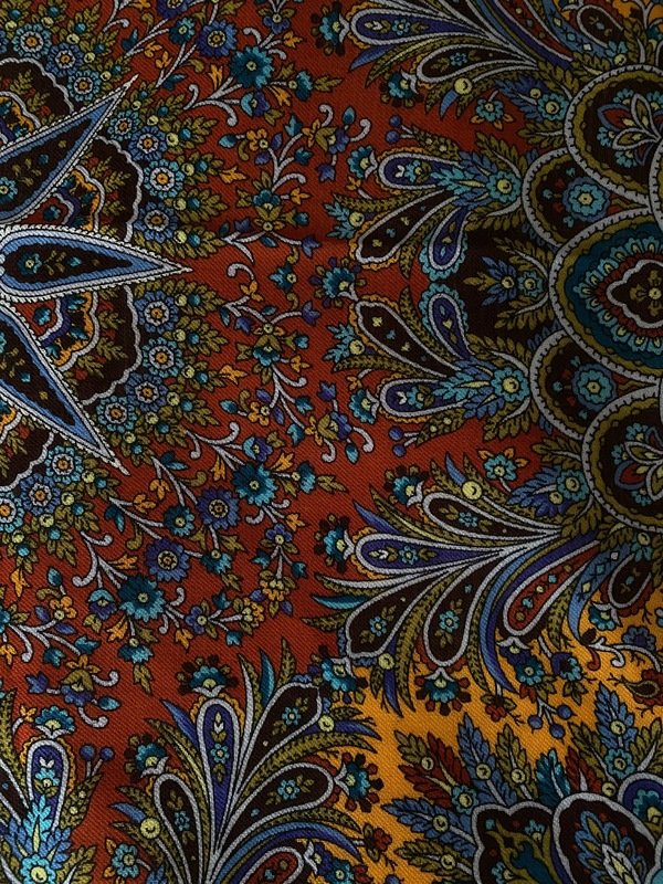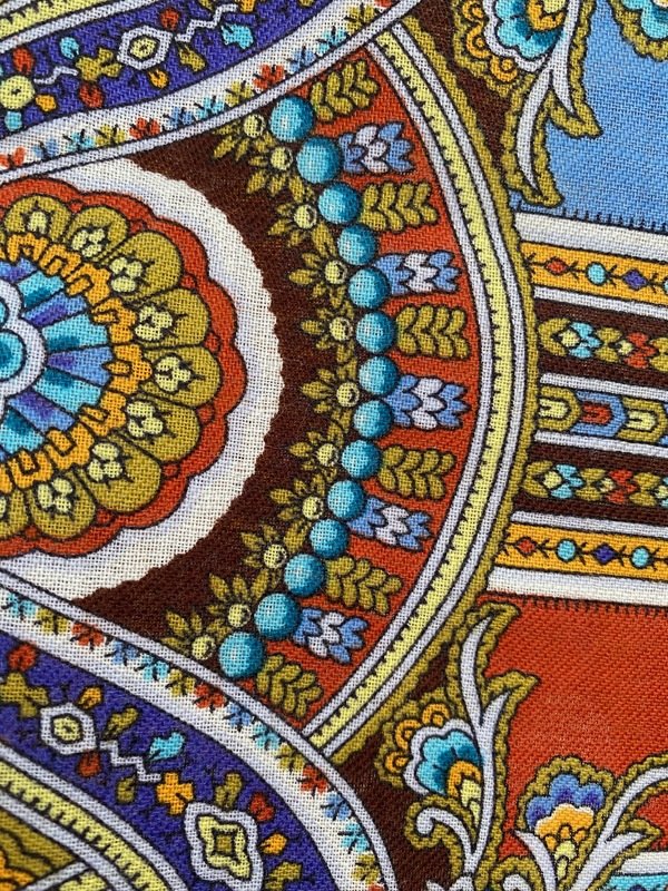 На фотографиях часто получается резким и чрезмерно ярким. По первому впечатлению--весь в целом, платок не оранжевый и не желтый. Он --голубой! Тона и полутона...Голубая синь, фиолетовые колокольчики. Самый светлый, голубой на кайме-- холодного чистого тона, льдистый и насыщенный. Мне показались все цвета синего--чистые, без примесей оттенков и "сложности". Красочный!