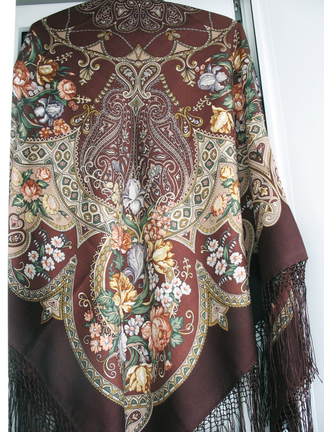 Зелёный совсем не яркий. Возможно камера чуть усилила зелень, но если только чуть. Мне нравиться, она оживляет, без неё было бы блекло на мой взгляд. Всё цвета смотрятся очень гармонично. Кстати, серые цветы вовсе не серые, серо-сиреневые(или лиловые? ) очень сложный цвет, камера не передала его. Мне эта шаль очень понравилась. Спокойная, элегантная, шоколадная) .