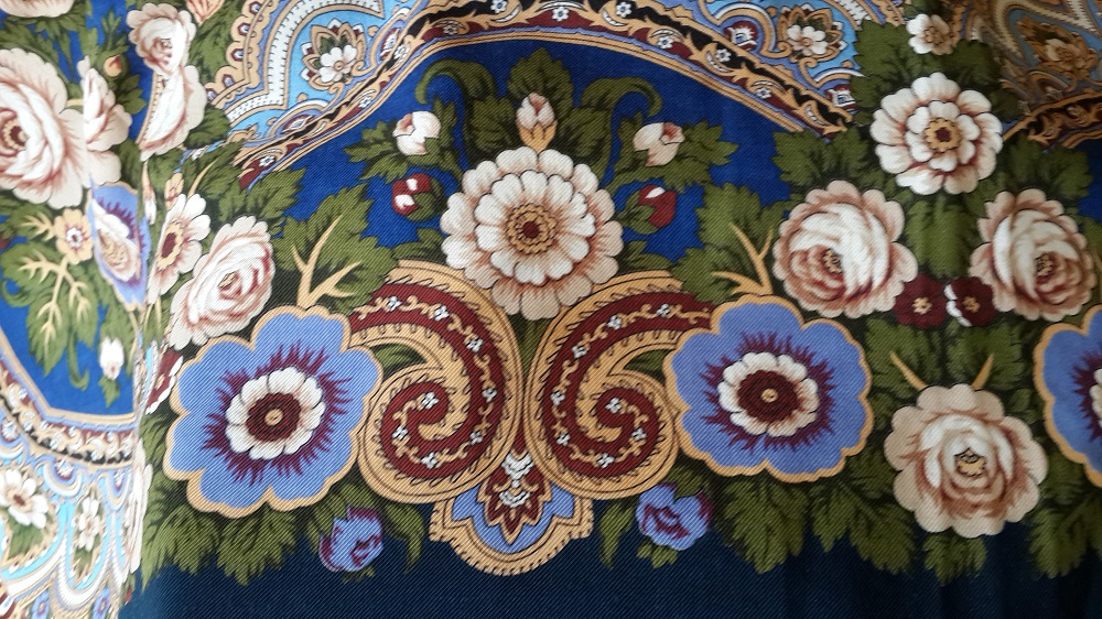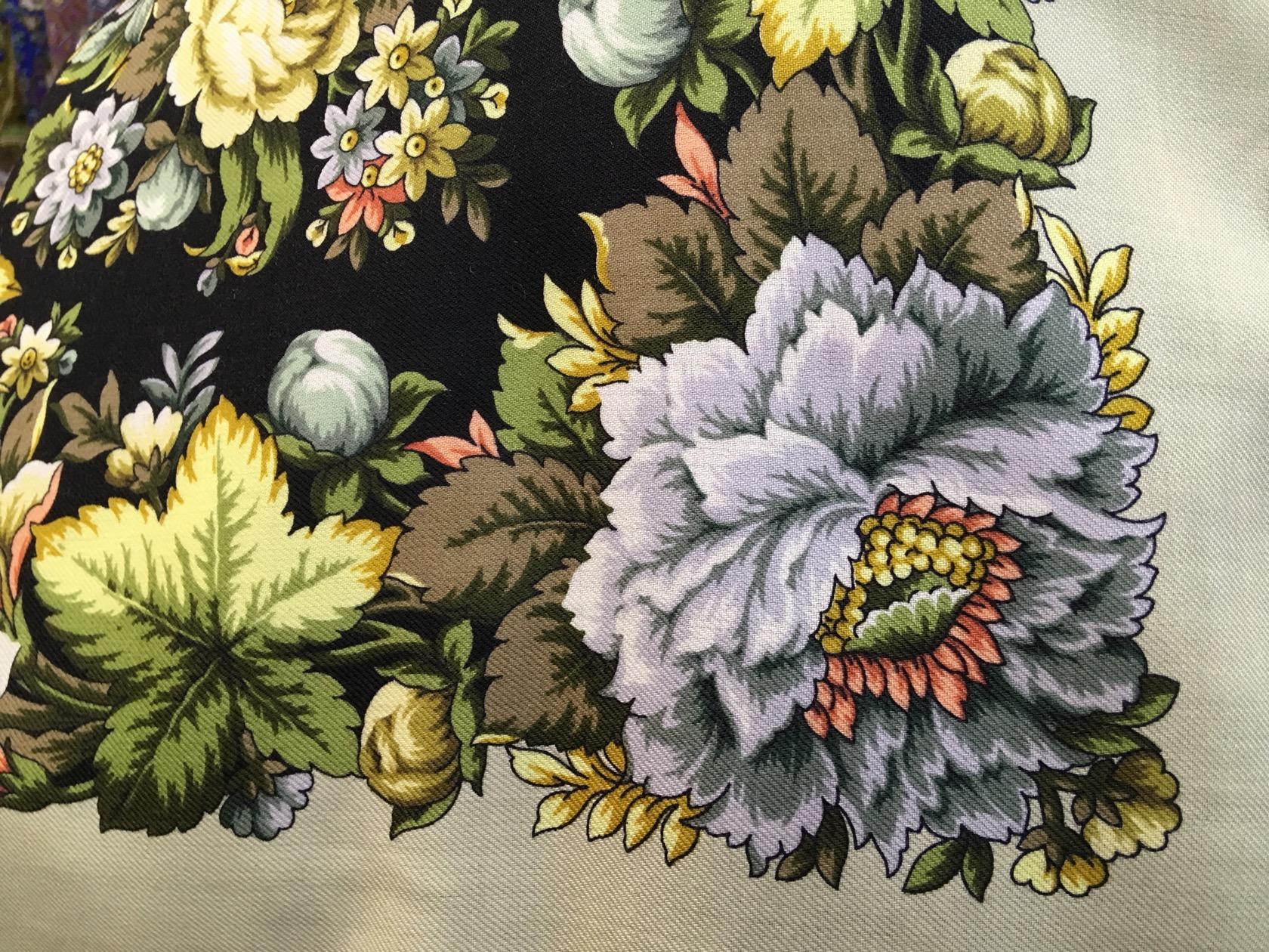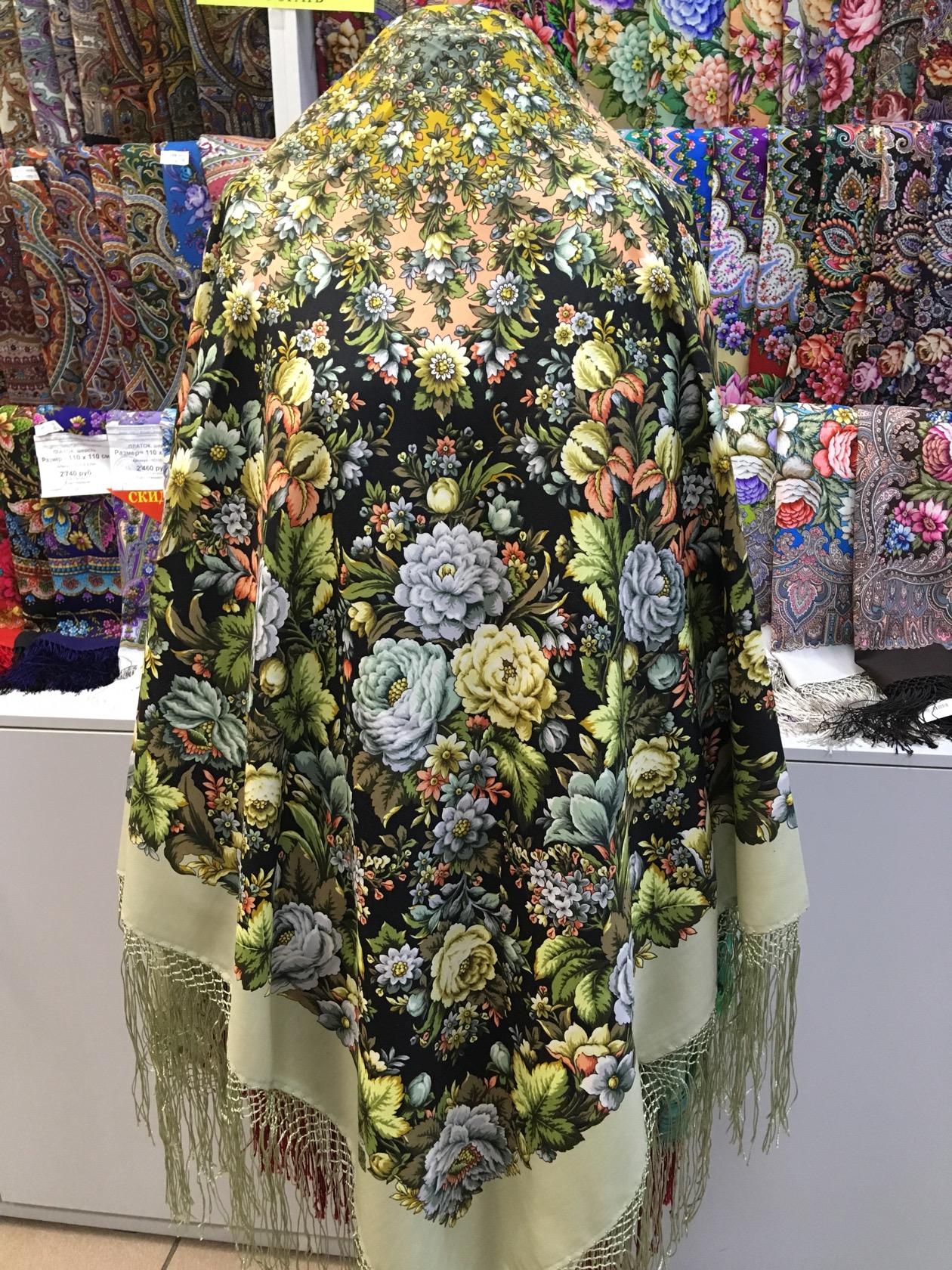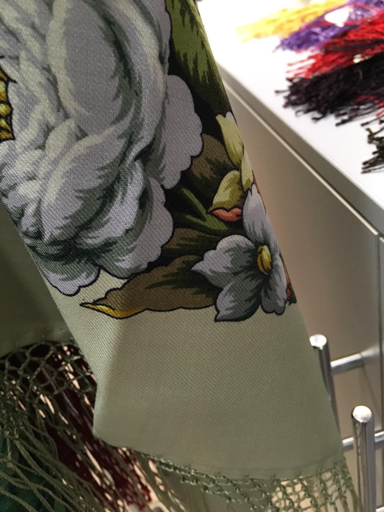 Тона этой шали очень зависят от освещения. Фотографии сделаны в фирменном магазине ППМ м."Курская". Шаль - стандартного сорта. При увеличении фотографий хорошо видны мелкие брызги краски.