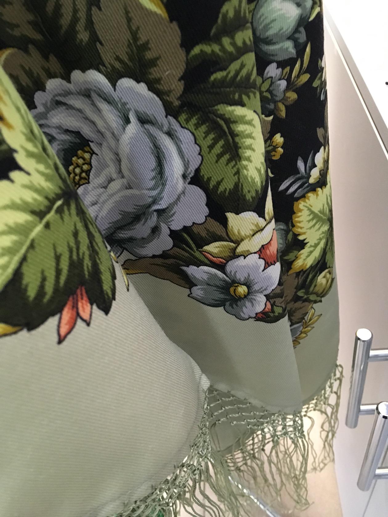 На этом фото видно - чуть только затемнение - "вылазит салатовость и оливковость". Не могу сказать - как шаль будет смотреться при ярком солнечном свете
